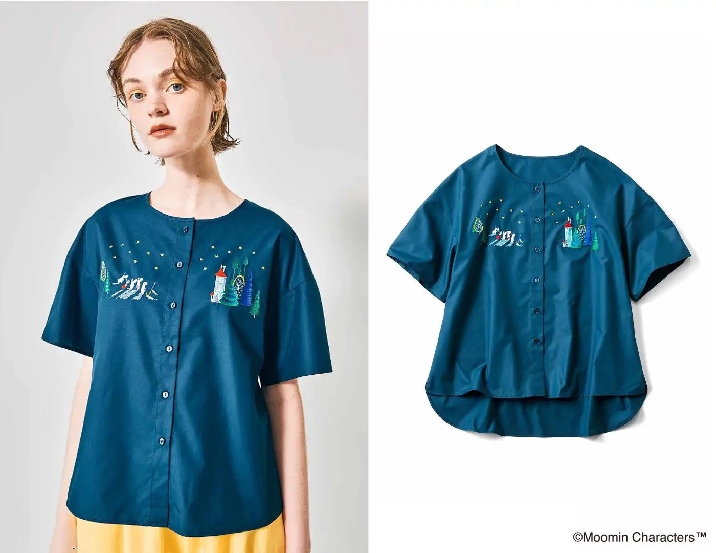 ゆったりとしたノーカラーの半袖ブラウスです。コミックスの絵柄をアレンジし、ムーミン屋敷に帰るムーミン一家を刺しゅうしました。夜空のような深いブルーグリーンの色合いに刺繍が映え、ロマンチックな雰囲気に。