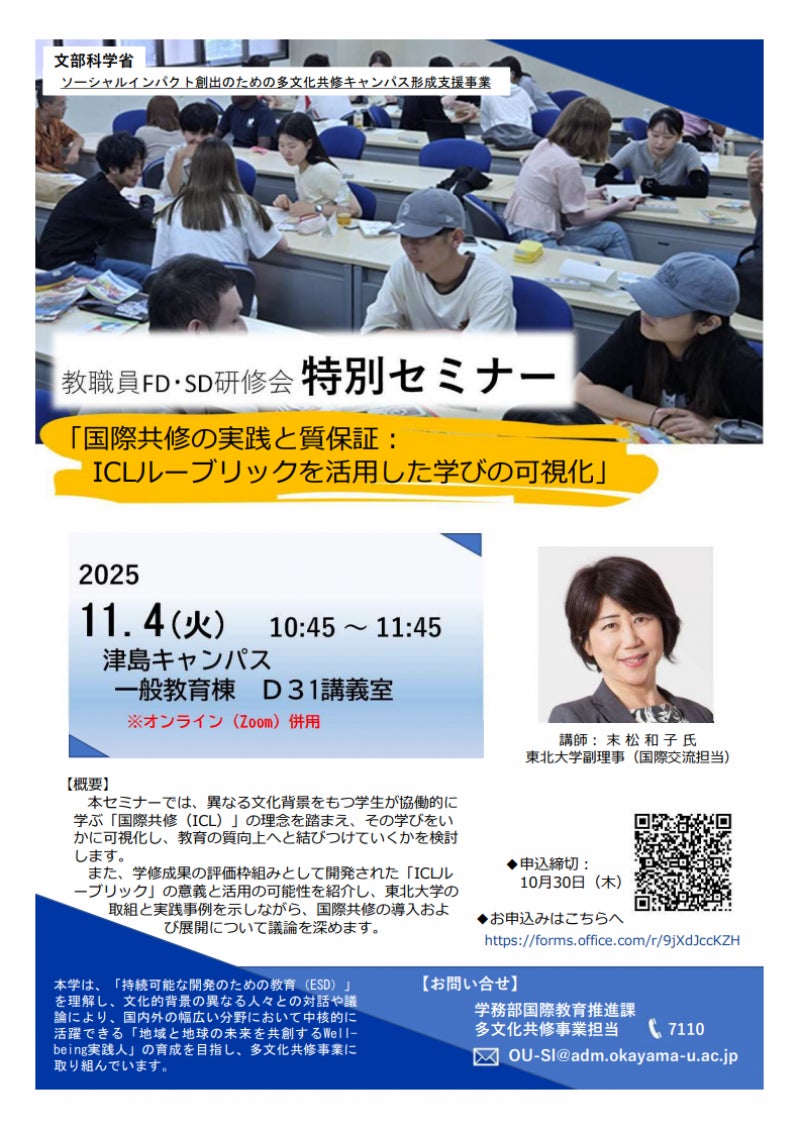 国立大学法人岡山大学(本部:岡山市北区、学長:那須保友)は、2025年11月4日、2024年度に文部科学省より採択を受けた「ソーシャルインパクト創出のための多文化共修キャンパス形成支援事業(多文化共修事業)」の一環として、同事業採択大学である東北大学副理事(国際交流担当)の末松和子氏を招き、特別セミナー「国際共修の実践と質保証:ICL※ルーブリックを活用した学びの可視化」をハイブリッド形式で開催し、約100人の教職員が参加しました。