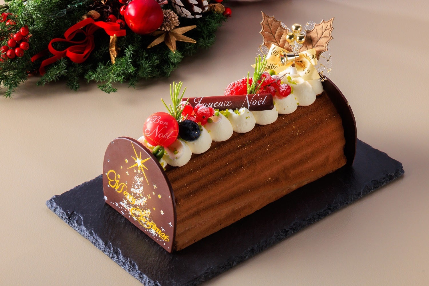 本年は「クリスマスショートケーキ」と「ノエル ド ショコラ」の2種類を、いずれも数量限定で販売いたします。限定200個の「クリスマスショートケーキ」は、甘さ控えめのクリームに国産苺を贅沢にちりばめた優しい味わいの王道ケーキです。2種類のチョコレートをブレンドしたムースで仕上げた限定100個の「ノエル ド ショコラ」は、ベリージュレのほど良い酸味がアクセントになっており、切り分けたときのピスタチオムースのグリーンとベリージュレのワインレッドがクリスマスカラーを彷彿とさせ、フェスティブシーズンの気分を一層盛り上げてくれる一品です。