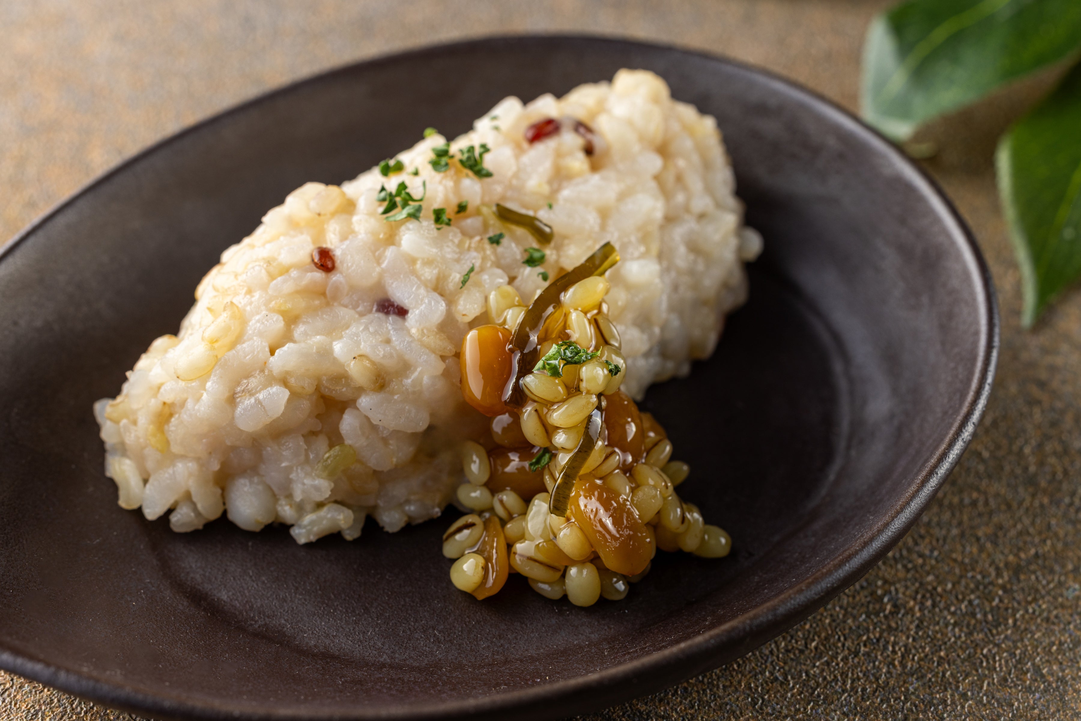 島原地方で古くからご飯のお供として食べられていた「島原納豆みそ」。麹の粒がしっかり残っており、生麹のため、麹の酵素がそのまま残っております。旨味たっぷりの納豆みそをパルミジャーノ・レッジャーノで仕上げたリゾットに添えてご提供。