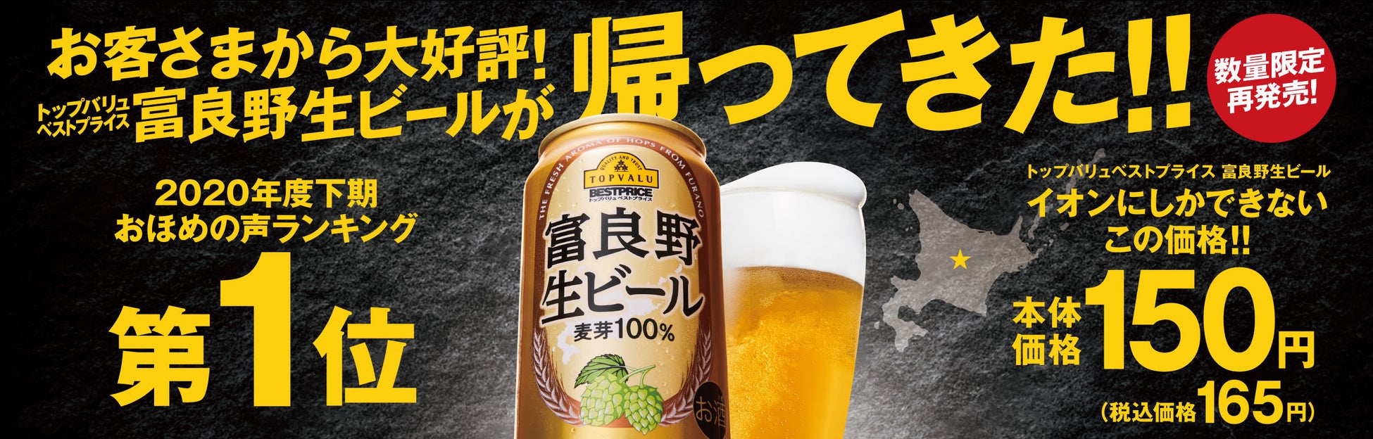 イオンは12月6日(火)、全国の「イオン」「イオンスタイル」「マックスバリュ」など、グループ約3,300店舗※1にて、美味しさと価格を両立させ、お客さまより多くのおほめの声をいただいた大ヒット商品「トップバリュベストプライス 富良野生ビール」を数量限定で再発売します。