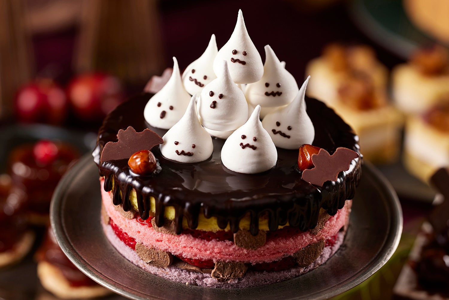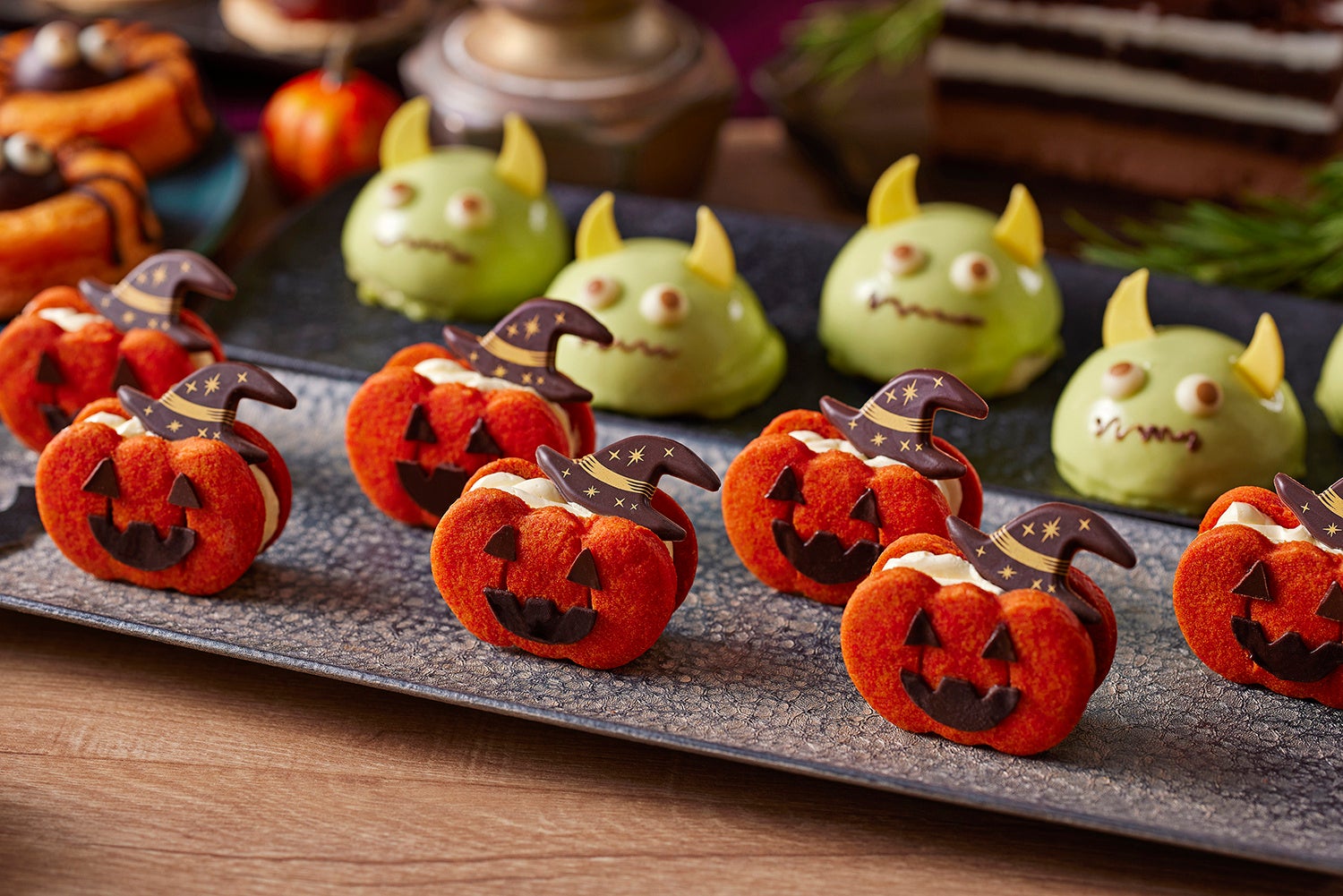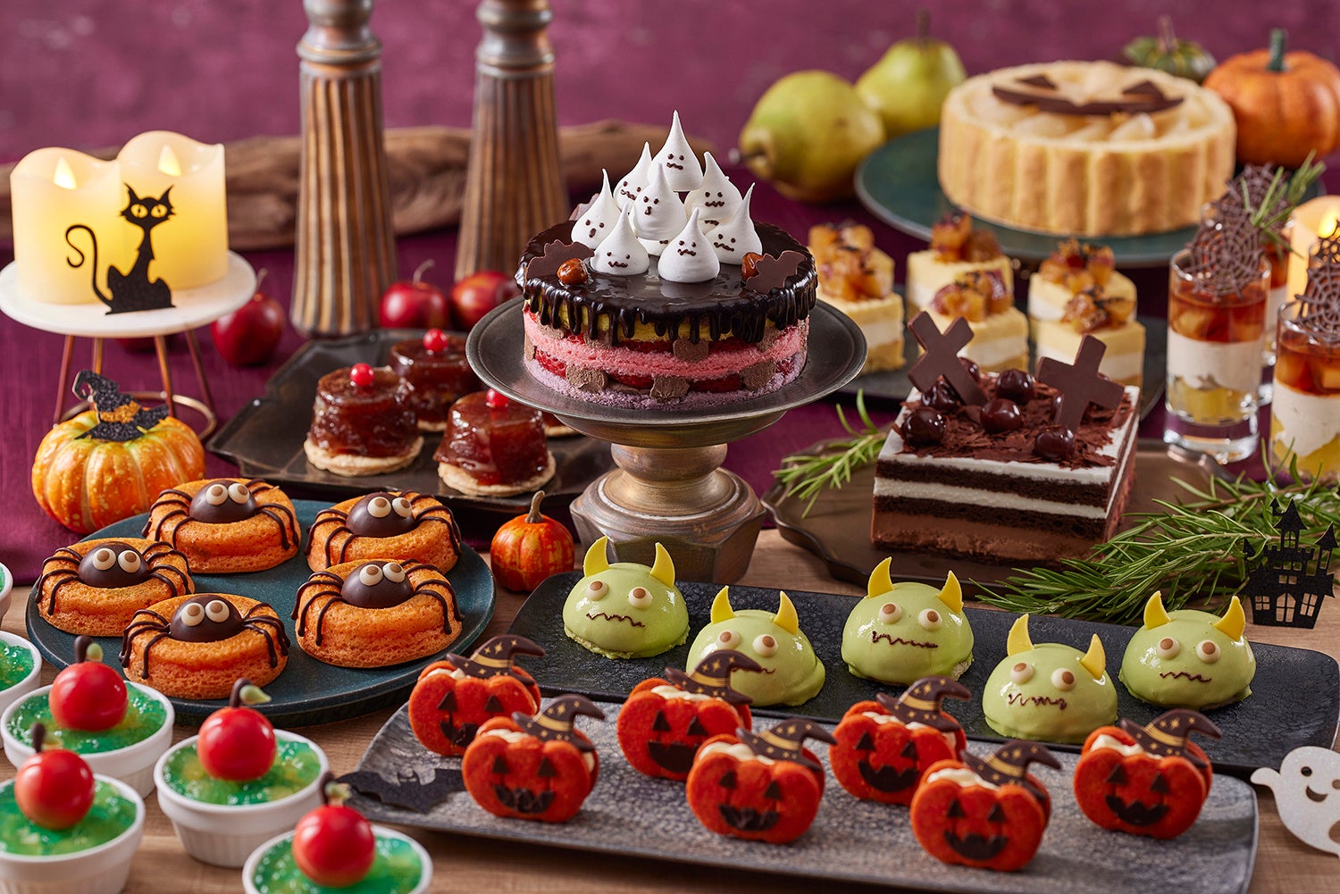 ブッフェテーブルには、身を寄せ合うメレンゲおばけたちがキュートな「ハロウィーンネイキッドチョコレートケーキ」や、キャラメルムースを覆うブルーグリーンのジュレとリンゴチョコが魅惑的な「魔女のリンゴケーキ」、魔法使いに扮したジャック・オー・ランタンが笑いかける「カボチャキャラメルバターサンド」など、約25種類の妖しくも可愛いスイーツが勢ぞろい。