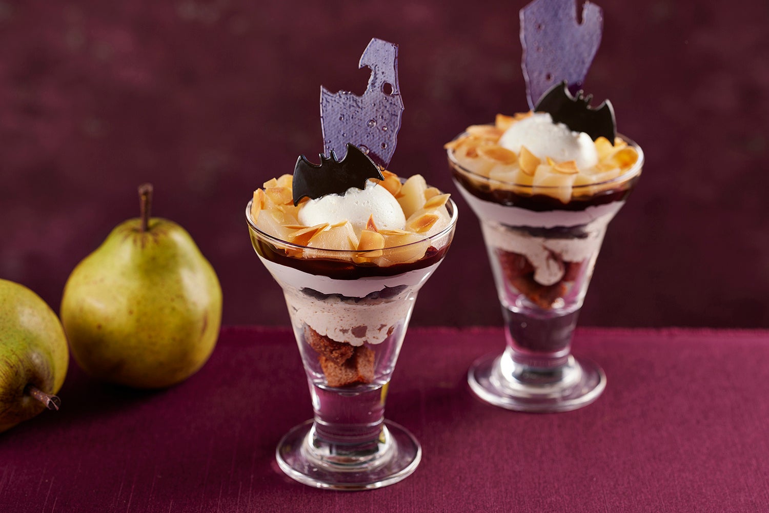 毎回人気のパフォーマンスキッチンでは「洋梨パフェ」をご用意。たっぷりと盛り付けた洋梨のコンポートを、洋梨風味の生クリームやアーモンドプラリネ入りのマスカルポーネクリーム、香ばしいローストナッツが引き立てる、実りの秋が詰まった一品です。トップはアイスクリームを月に見立て、コウモリが舞うハロウィーンナイトをイメージしました。