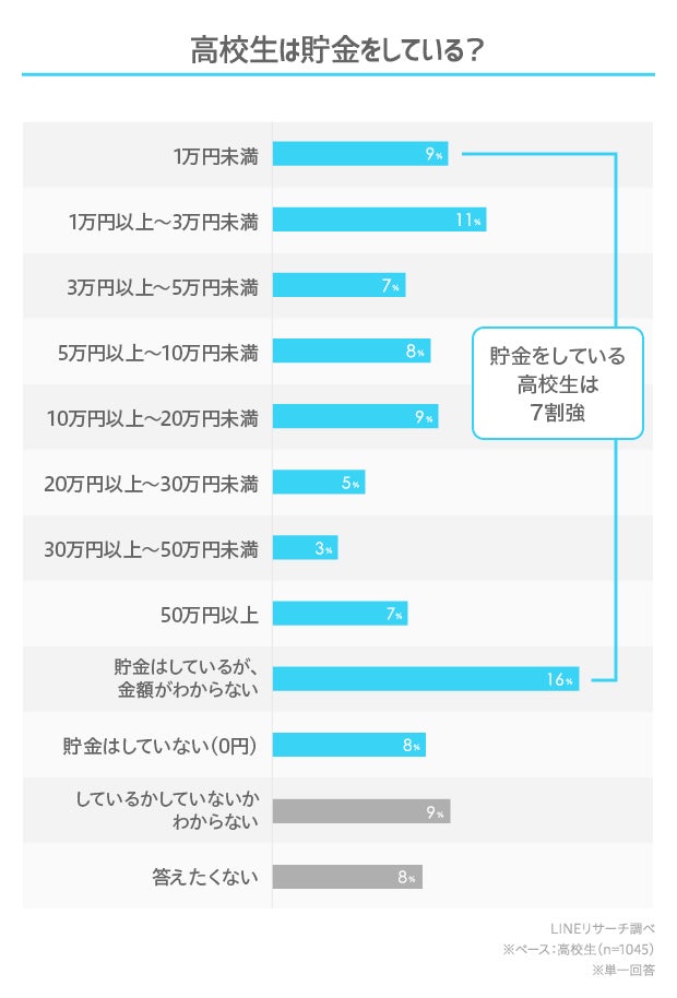 貯金額としてもっとも高い割合だったのは「1万円以上~3万円未満」で11%でした。次いで、「1万円未満」「10万円以上~20万円未満」でそれぞれ9%、僅差で「5万円以上~10万円未満」が8%と続きます。「50万円以上」という高校生も7%いました。一方で、「貯金はしているが、金額がわからない」と回答した高校生は16%となりました。