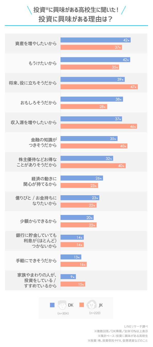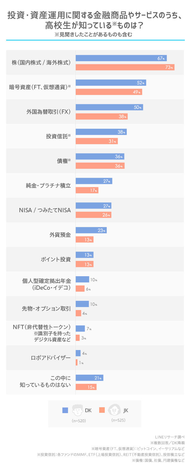 【LINEリサーチ】高校生の半数が投資に興味があると回答、投資に興味がある理由は「将来、役に立ちそうだから」が最多 高校生が知っている金融商品は「株」と「暗号資産」が上位にランクイン