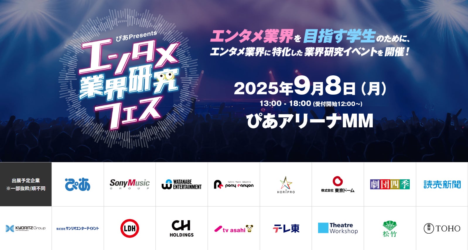 2025年9月8日(月)、ぴあ株式会社がエンタメ業界に特化した業界研究イベントを開催。テレビ局、映画、音楽、芸能、ライブ、映像制作、出版、広告、舞台、運営・技術会社まで── “エンタメ業界”の最前線を支える企業が一堂に集結!