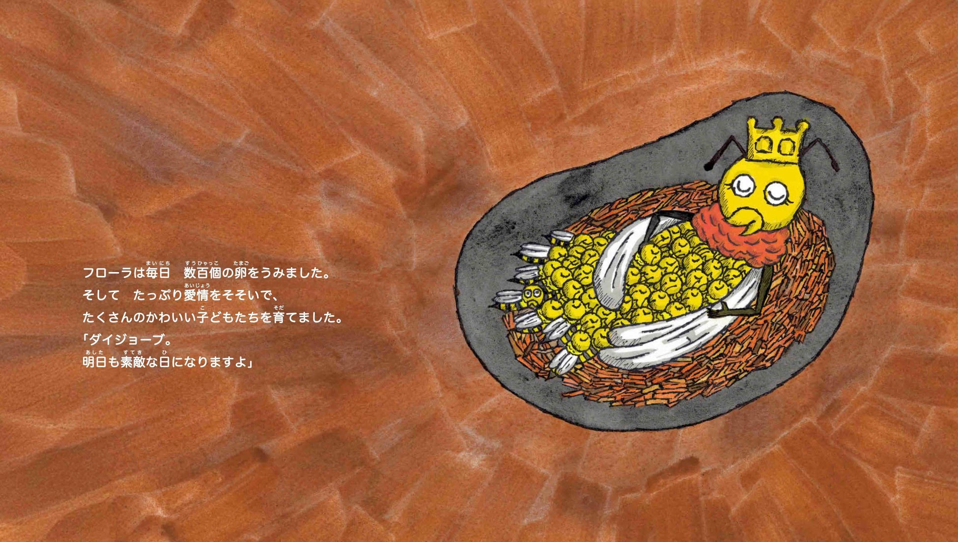 フローラは、たくさんの子どもたちを育てる女王ばち。みんなで一生懸命につくりあげたお城へ、たくさんの動物たちがはちみつをうばいにやってきます。どんなにつらいときも「ダイジョーブ、ダイダイジョーブ」と、子どもたちを元気づけるフローラ。フローラの願う“しあわせな明日”って、いったいどうすればやってくるのでしょうか?