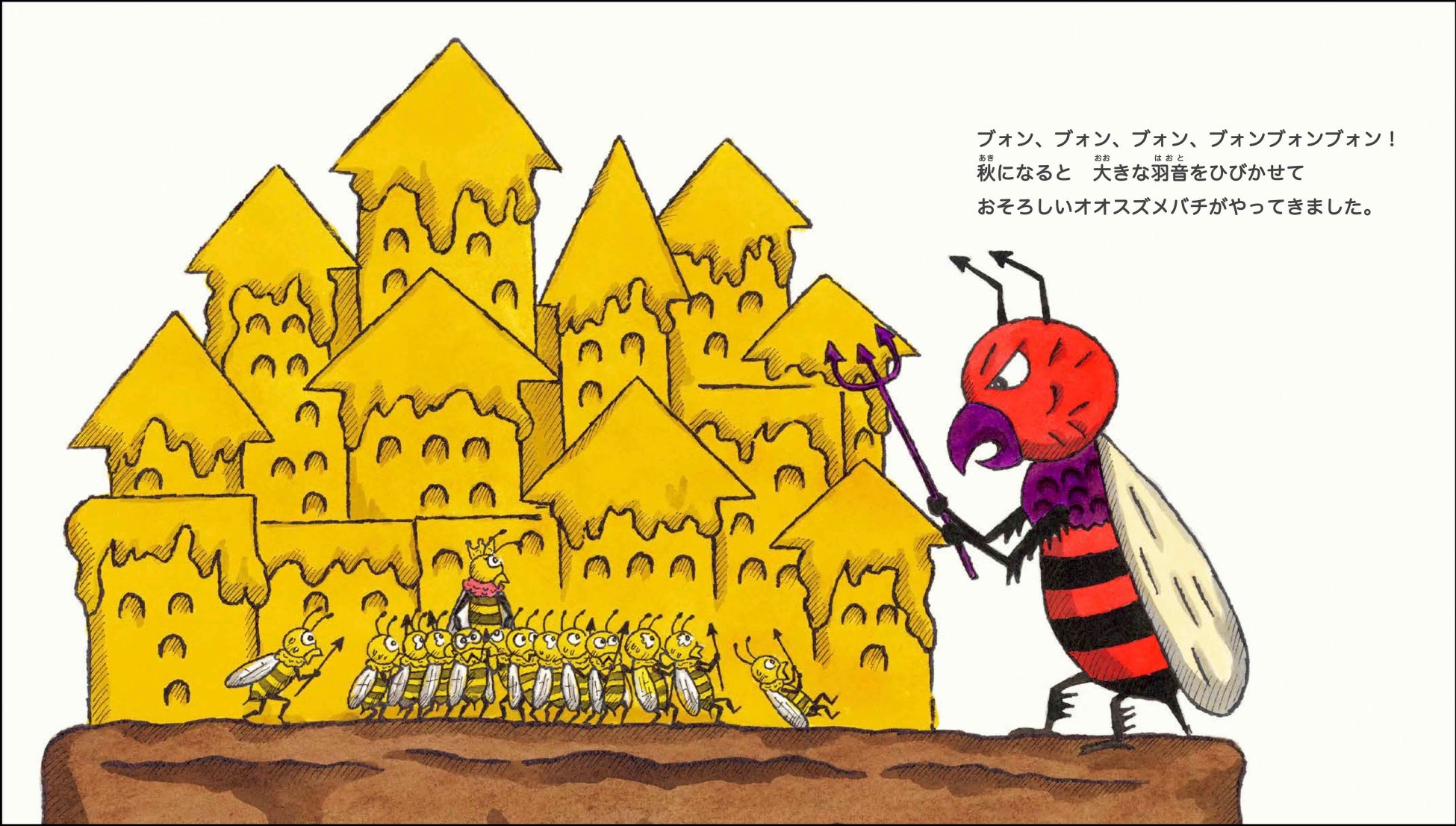 いま世界はあまりいい状態とは言えません。第二次世界大戦を経験して懲りたはずなのに、世界中で人々が奪いあい殺しあっています。そんな殺伐とした空気を少しでも和らげるメッセージを、絵本でおくれないかと考えました。でも、正義を振りかざして声高に平和を叫んでも、人々の心にはなかなか届きません。子どもから大人まで、大国から小国まで、多くの人が抵抗なく読めるたとえ話を考えることにしました。それは、人間の世界ではなく、働き者のみつばちの世界です。いくつもの困難の中でも挫けずに淡々と蜜を集め続けるみつばち。そこで感じるのは、人間の世界の縮図です。人間たちが分け合う心、弱者に寄りそう心を考えるきっかけを作れれば・・・・・・と思っています。日本だけでなく世界中で読まれる絵本として、平和のメッセージを送りたいと思います。(本田亮)