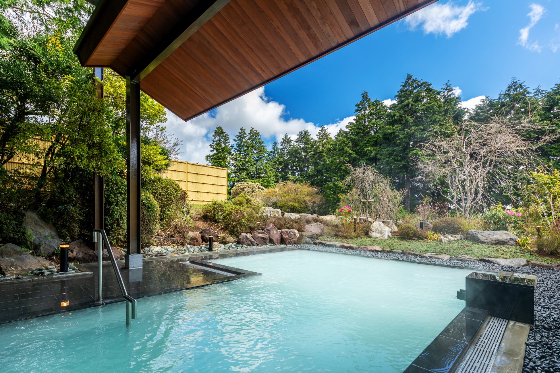 湯ノ花沢温泉は、駒ヶ岳東斜面の海抜約950m地点、箱根十七湯の中では最も高い位置にあります。箱根でも希少な乳白色のにごり湯は発汗作用があり、湯冷めしにくく美肌の湯として評判です。当ホテルで提供するのは地熱蒸気を利用した「蒸気井(じょうきせい)造成温泉」です。孔底350mから噴出する 180°の蒸気は蒸気井(地熱蒸気の井戸)を通って湯畑で沢水と掛け合わせて60°の温泉を造成します。