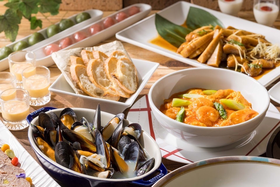 ・スモークサーモンのミルクレープ、ディルとケイパー風味・プロヴァンス風パテ、コンディマン色々添え・丸鶏仕込みの棒棒鶏・ブルターニュ風ムール貝のマリニエール・ケサディーヤ・中華風小海老のマヨネーズ和え・トマトのコールドスープ ほか