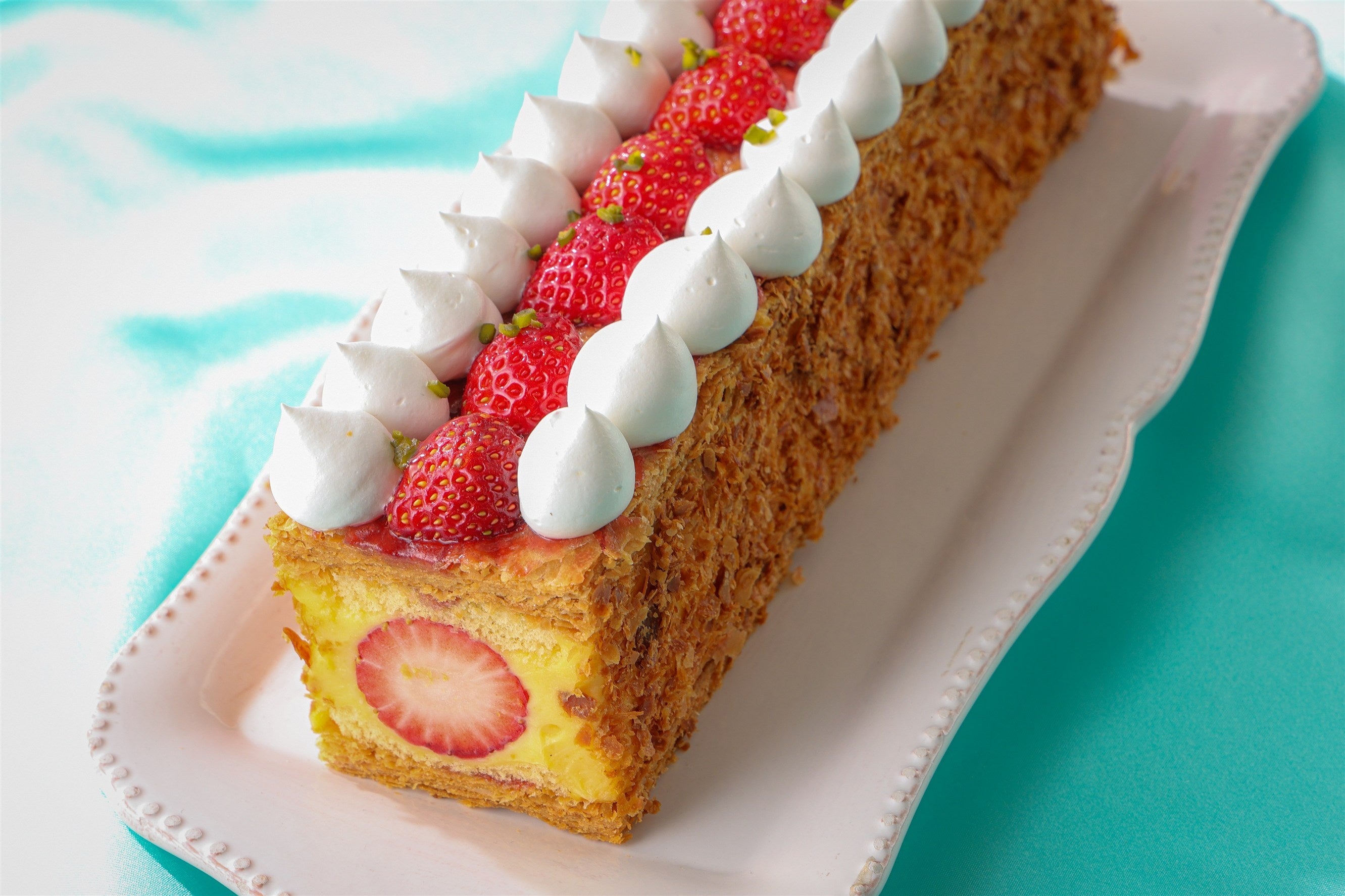 1964年のホテルニューオータニ開業当時より60年以上愛され続ける「ナポレオンパイ」は、フレッシュいちごと相性抜群の特製カスタードをたっぷりと使用。サクサクのパイ生地、カスタードクリーム、スポンジ生地、いちごと生クリームが幾重にも重なる、王道にして不動の人気を誇る逸品です。