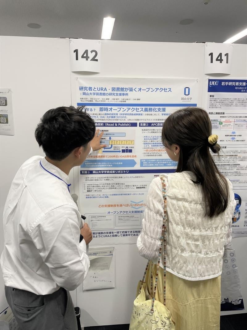 図書館からは、研究支援の取り組みとして、「研究者とURA・図書館が築くオープンアクセス:岡山大学図書館の研究支援事例」および「岡山大学図書館における人文系研究データデジタル化支援:OS時代に向けて図書館ができる研究支援業務」と題して2件のポスター発表を行いました。