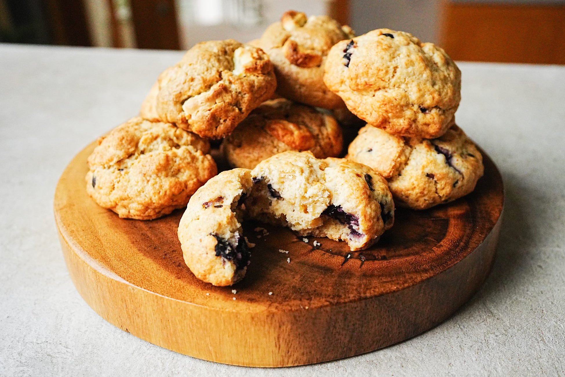 ごろっとしたブルーベリーの実や、アールグレイが香るさくふわのスコーン生地に、フランス・ヴァローナ社のホワイトチョコレートを一緒に焼き込みました。