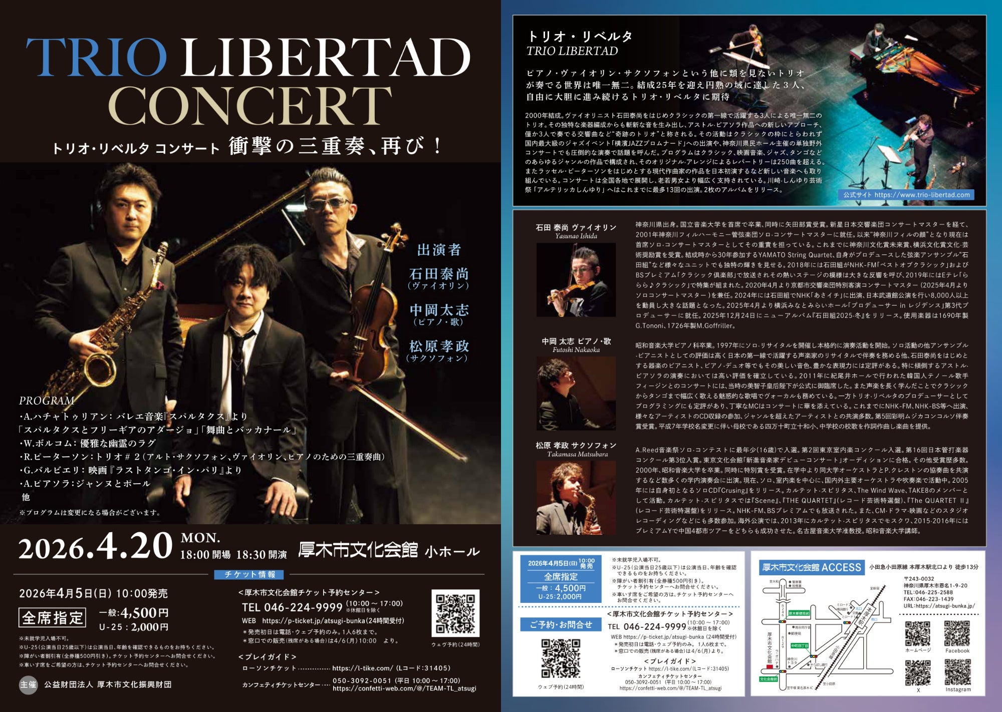 『トリオ・リベルタ コンサート』が2026年4月20日(月)に厚木市文化会館 小ホール(神奈川県厚木市恩名1丁目9-20)にて開催されます。