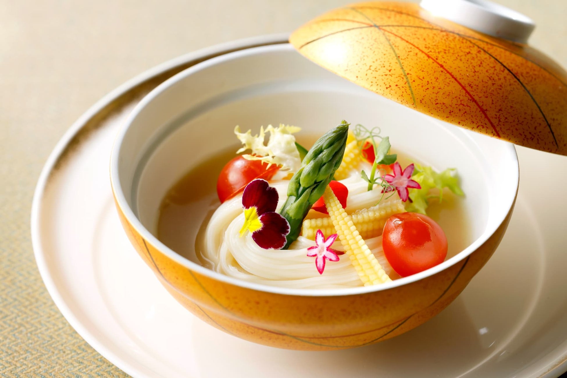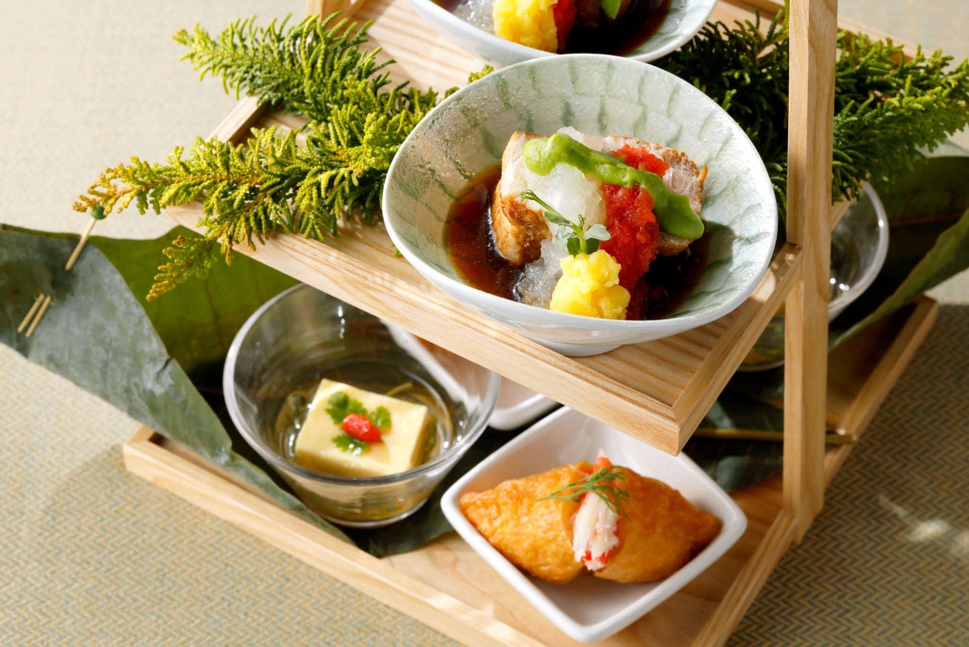 セイボリーには、さっぱりとした味わいの和食メニューを4種ご用意いたします。中でもおすすめは「からまつ肉じゃが」。ペースト状にした野菜の優しい口当たりと、じっくり煮込んだ角煮の濃厚な旨味が絶妙に絡み合う、新感覚の肉じゃがです。また、華やかに飾り付けた「胡麻豆乳クリーム冷やし素麺」もぜひ味わってほしい一品です。クリーミーでコクのある胡麻豆乳ソースがつるりとした素麺によく絡み、ひんやりとしたのど越しが暑い日でも食欲をそそります。他にも、「トウモロコシの玉蒸し」「蟹稲荷寿司」を提供いたします。和食料理人がひとつひとつ丁寧に仕上げる日本料理を、スイーツとともにお楽しみください。