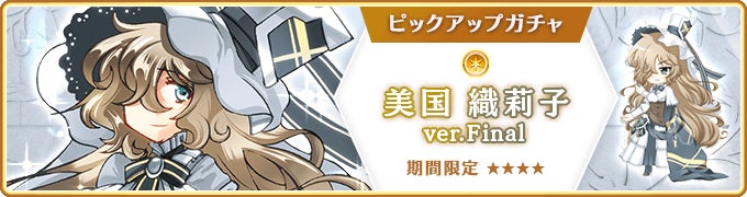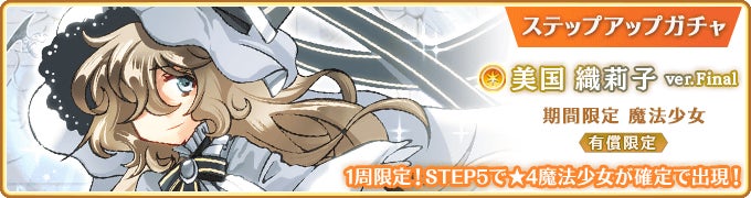また、本ガチャの開催と合わせて『期間限定 美国織莉子 ver.Final ピックアップガチャ』をお得に引ける『有償限定 ステップアップガチャ 美国織莉子 ver.Final編』を開始いたしました。
