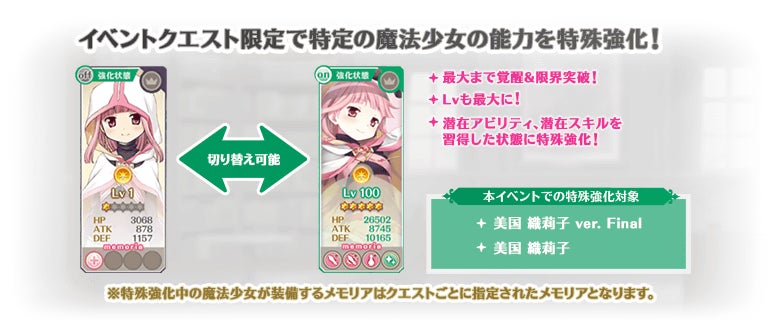 対象の魔法少女を編成して本イベントクエストをプレイする際に、ステータスを特殊な状態に強化することができます。