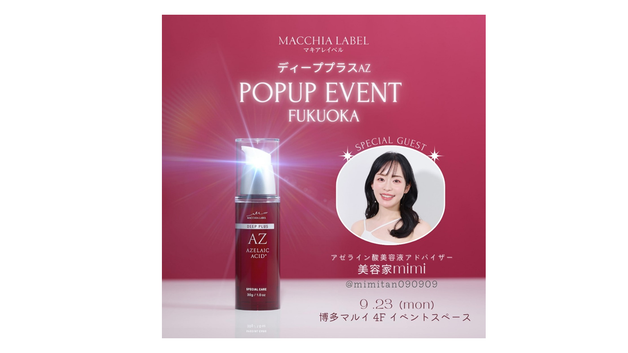 博多マルイ(株式会社丸井、本社:東京都中野区、取締役社⻑:⻘野 真博)4Fイベントスペースにて、美容家「mimi」と、マキアレイベルの美容液「ディーププラスAZ」のコラボイベントを開催します。