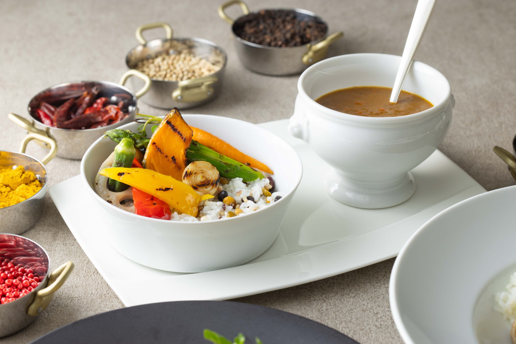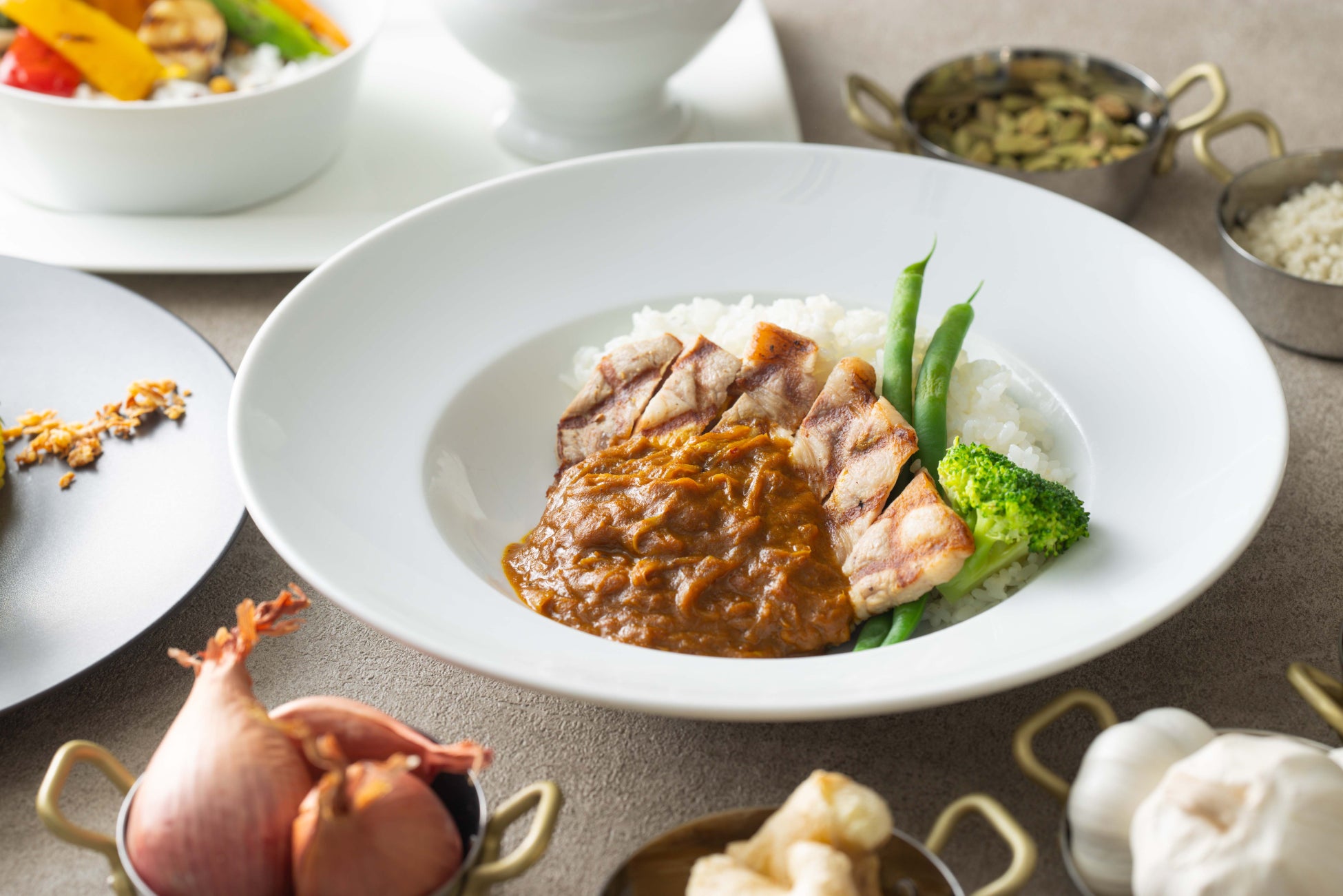 弱火で丁寧にソテーした野菜にオリジナル配合のスパイスを加え、香りが立つまでじっくりと炒めたルーが味わいの核を作ります。さらに、鶏ガラから手間ひまかけて抽出したブイヨンを加え、辛みを抑えたまろやかで奥深いスープに仕上げました。彩り豊かなグリル野菜を添え、スパイスの風味を引き立てる五穀米とともにご提供いたします。