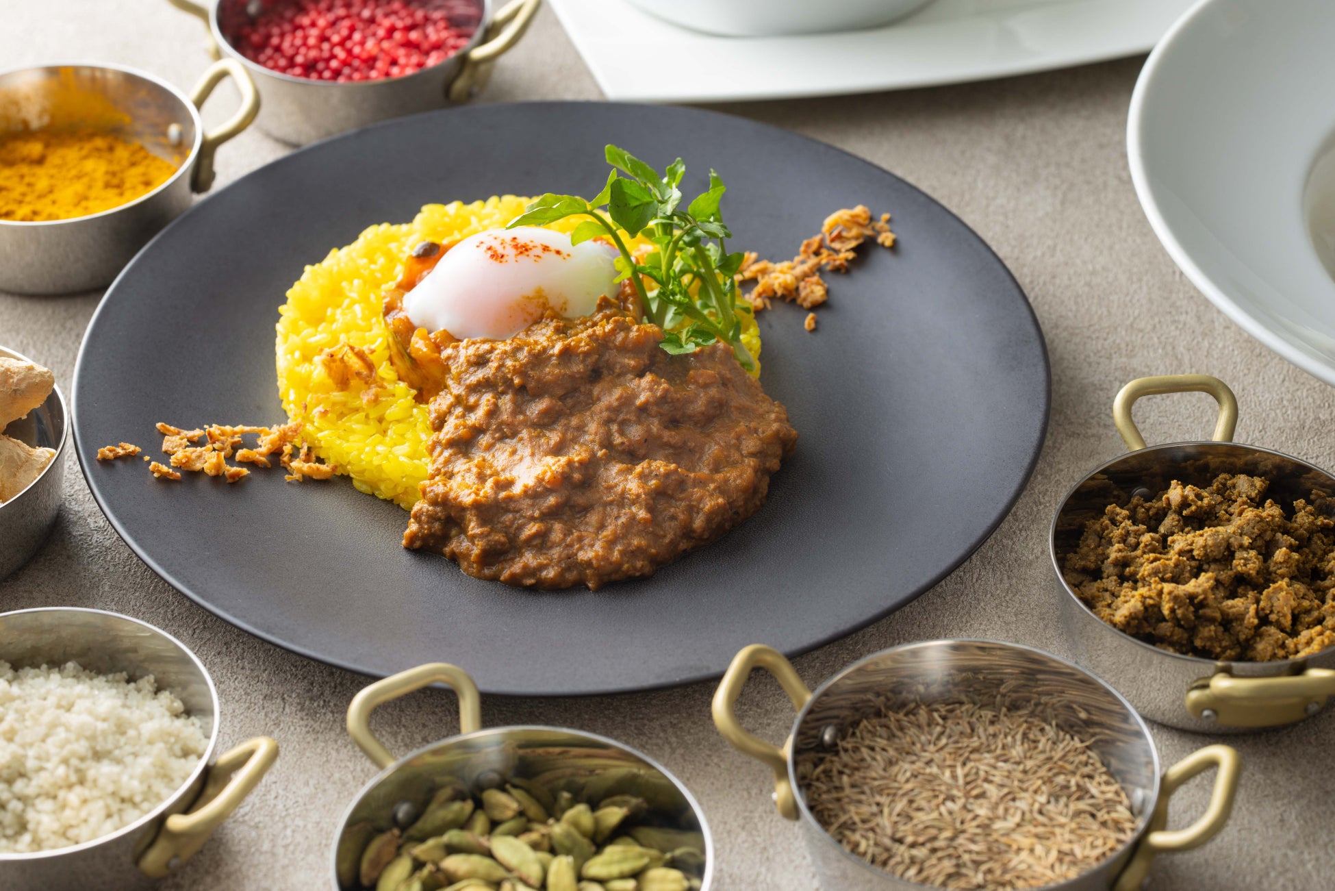 じっくり炒めたたまねぎにオリジナル配合のスパイスが絡み合ったコク深いルーは、食べ応えがありながらも滑らかで、豊かな香りが広がります。あえて粗挽きにした牛肉を使用することで、噛むほどにあふれる肉の旨みとほどよい食感を引き出しました。添えられたラタトゥイユと温泉玉子が絶妙なアクセントとなり、まろやかさと奥行きのある風味をプラス。一皿の中で変化していく味わいをお楽しみいただけます。