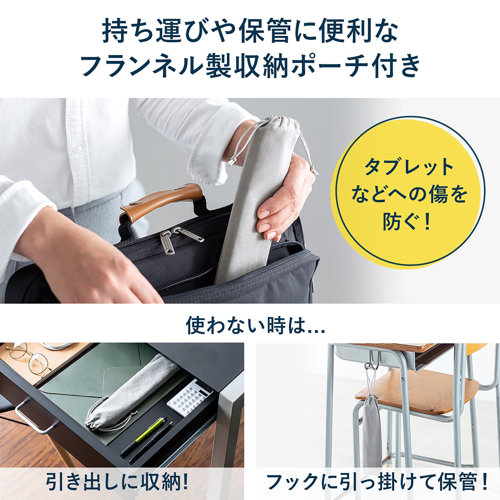 本製品は、コンパクトに折りたたんで収納・持ち運びが出来るタブレット用のモバイルスタンドです。