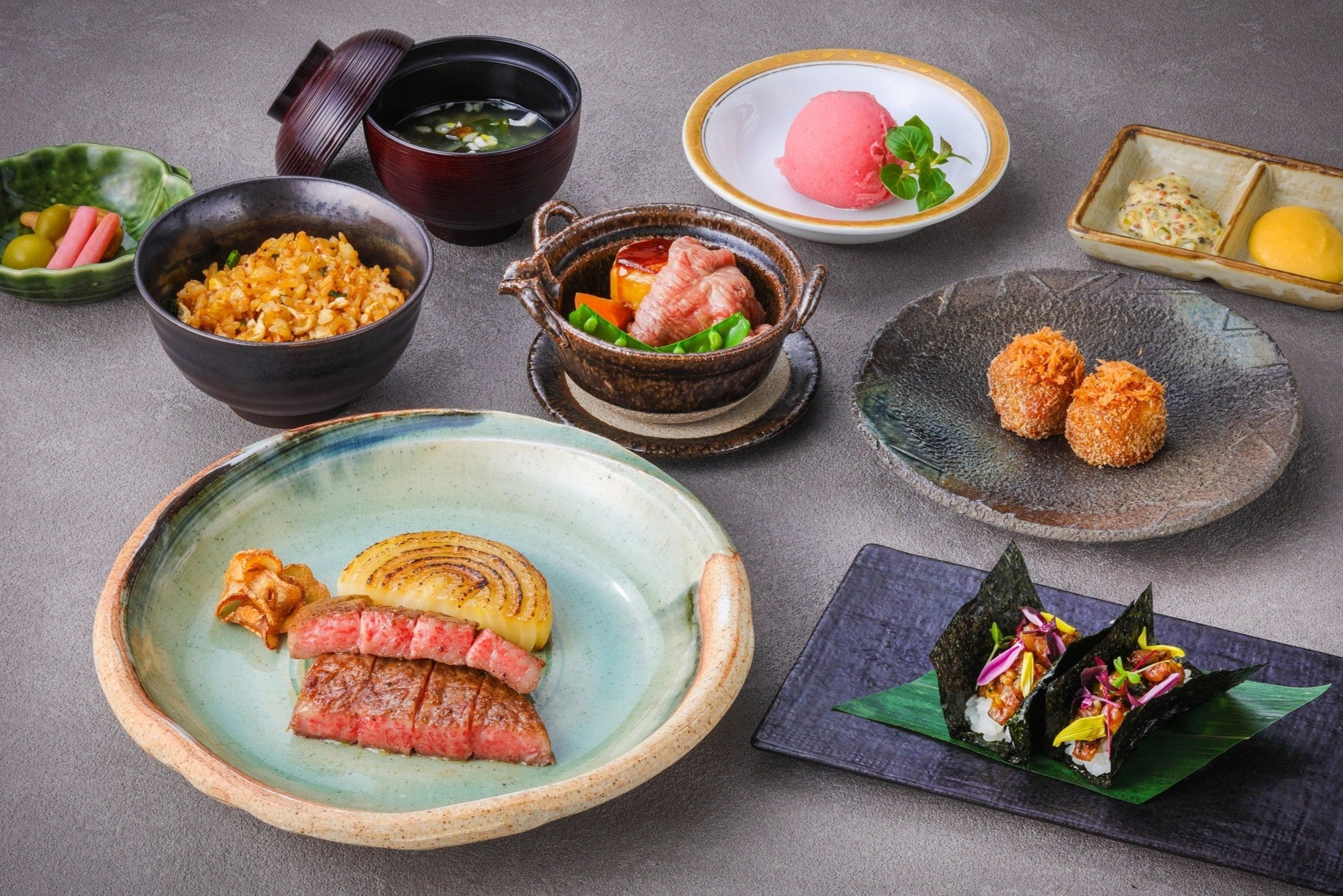 『鉄板焼 欅限定コース』では、近江牛の格別な旨味を、風味豊かななめろうに仕立てた「近江牛なめろう手巻き寿司」で食の幕開けを。続いて、神戸ビーフの繊細な赤身とフォアグラの芳醇なコクを香ばしく仕上げた一皿は、コンソメスープが全体の風味をまとめ上げます。さらに、松阪牛の極上の口どけをサクサクの衣に閉じ込めた一口サイズの「松阪牛のミニコロッケ」もございます。そして、メインには三大和牛からお好みに合わせた逸品をお愉しみください。きめ細やかな肉質と芳醇な香りを誇る近江牛サーロインステーキ100g、霜降りと極上の甘みが魅力の松阪牛サーロインステーキ100g、赤身の旨味と上品な脂のバランスを持つ神戸ビーフサーロインステーキ80g(追加料金)をはじめ、希少なフィレステーキもご用意。最高の部位を最高の状態でお召し上がりいただけます。お連れさまとシェアして2倍愉しむのもおすすめです。