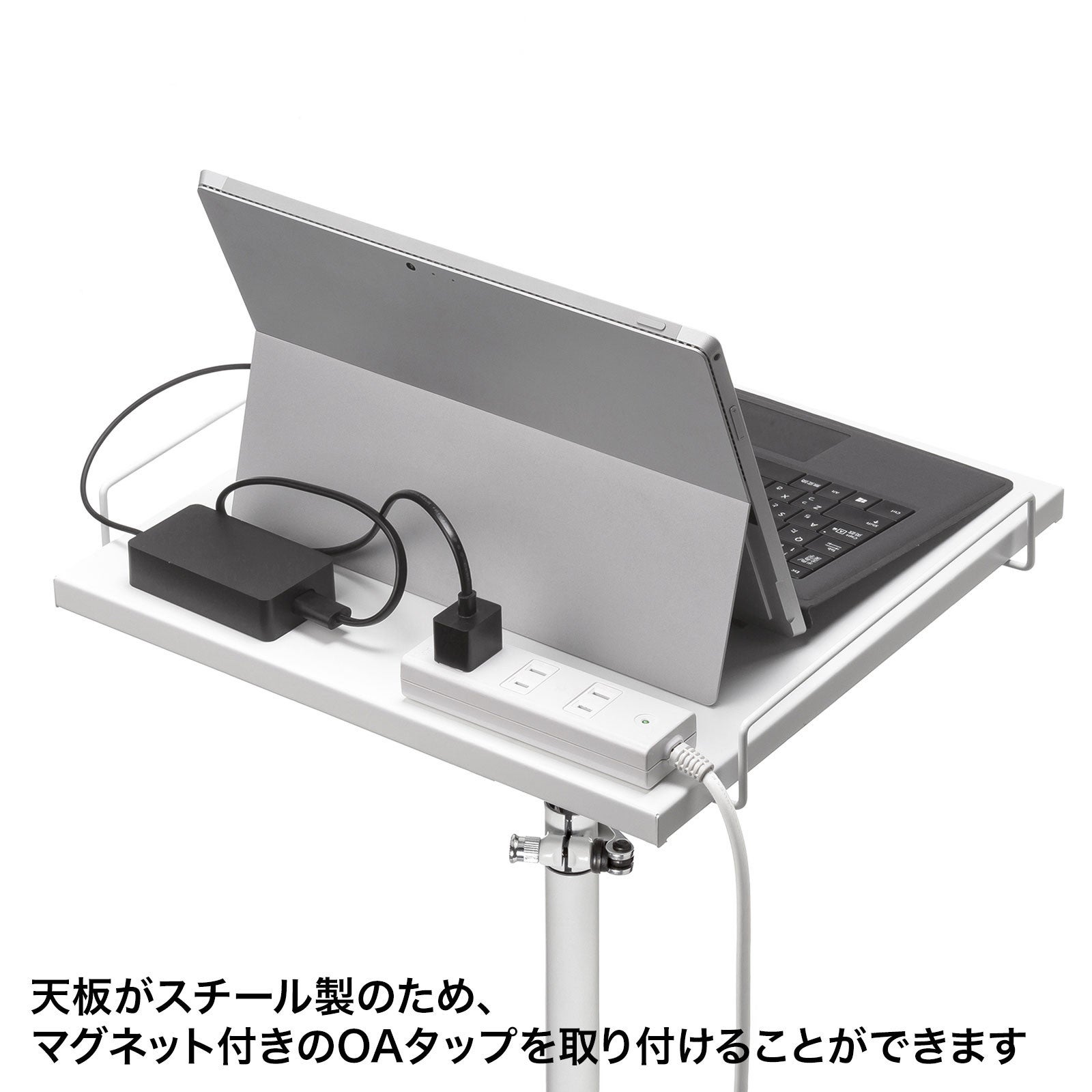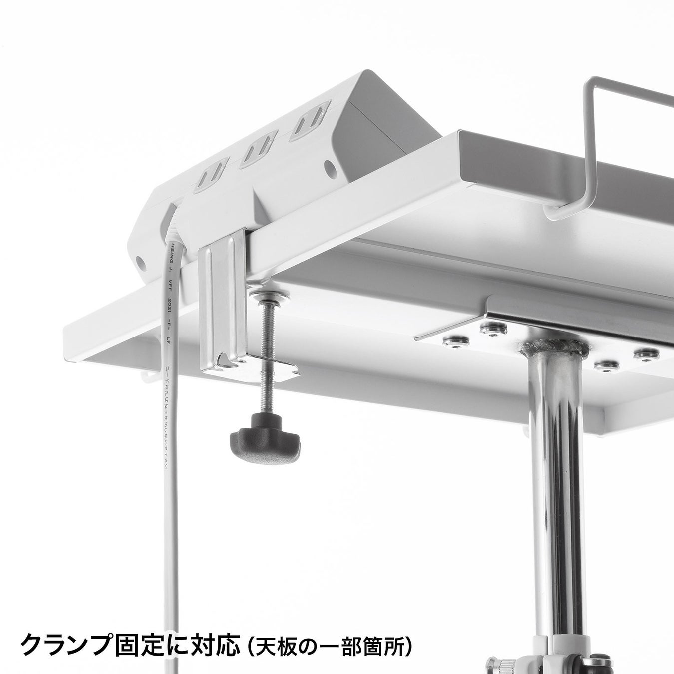 天板はスチール製のため、マグネット付きの電源タップを取り付けられます。また、一部の箇所にクランプ固定できる部分を設けており、クランプ取り付けタイプの電源タップなど固定して設置可能です。