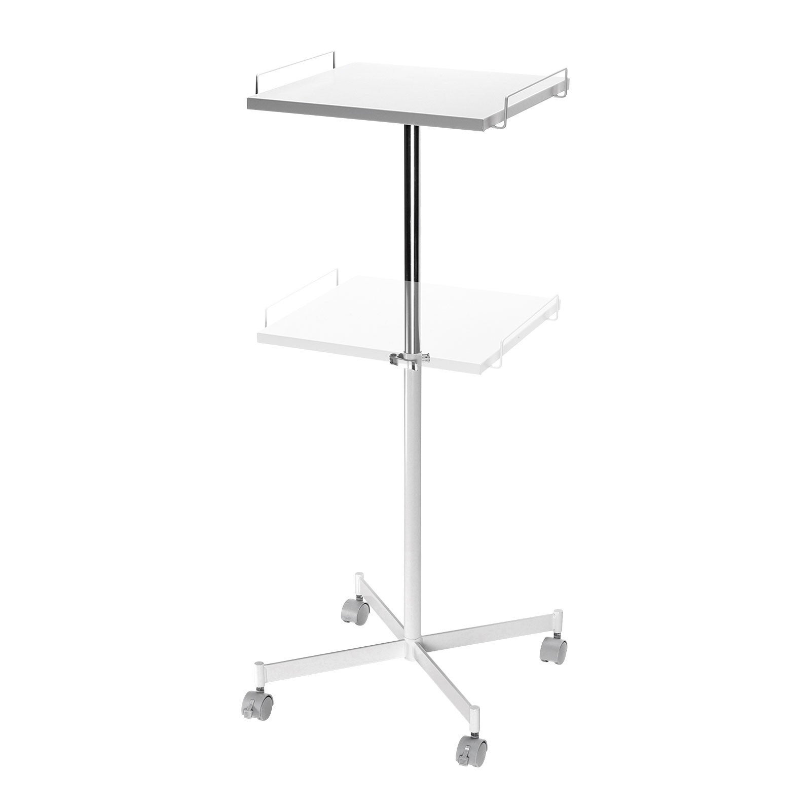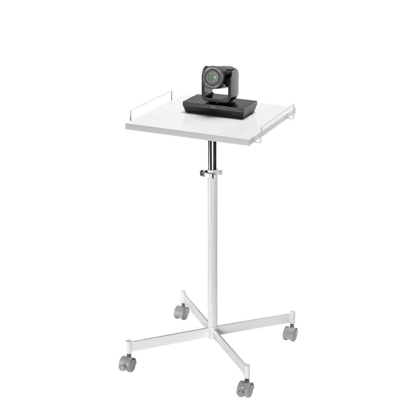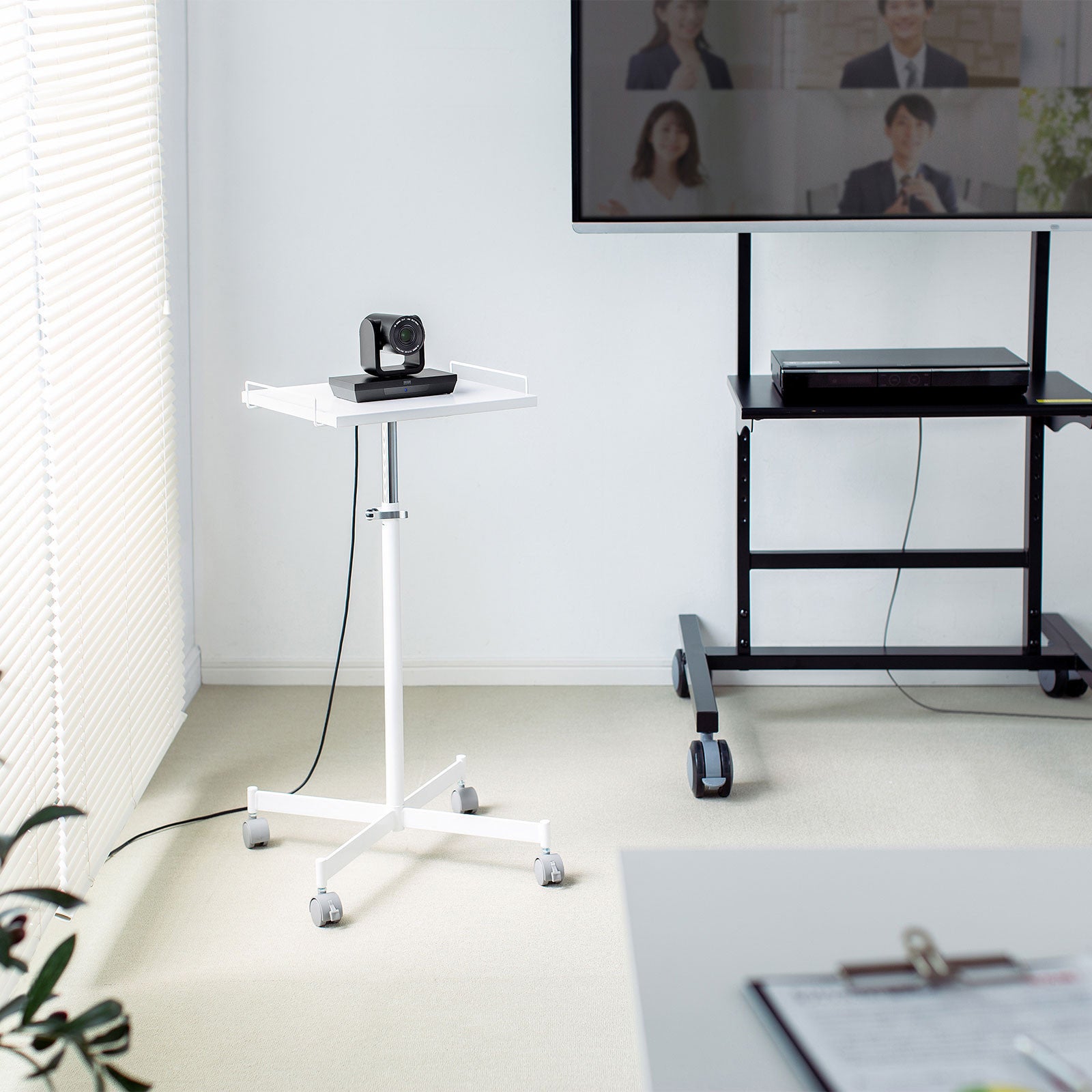 幅350×奥行き350mmの正方形型天板で、設置時に場所を取らないコンパクトタイプです。高さ調節機能や移動に便利なキャスターがついているため、WEB会議に使用するカメラやマイクの設置台として使用できます。