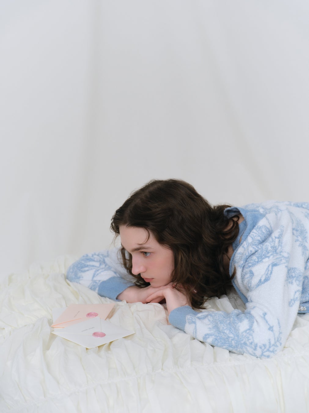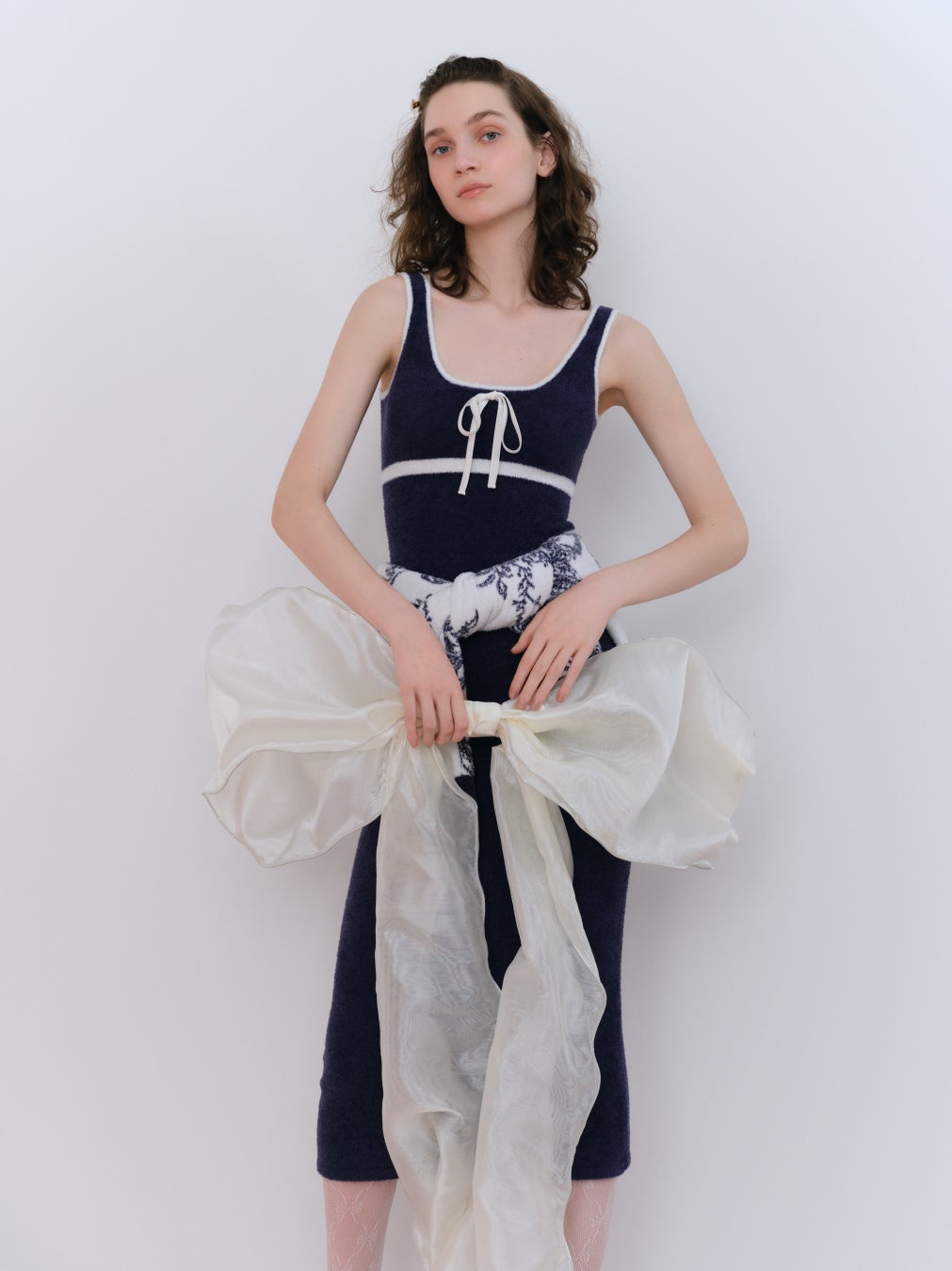 とろみのあるなめらかなカットソーに、ふんわりと結んだ大きなリボンをプリントしたワンピース。リボンとフラワー柄のトワル・ド・ジュイ柄をプリントしました。ハイウエストで切り替えを入れた、ゆったりとしたボクシーなシルエット。裾と袖口はメローデザインでさりげなくフェミニンさを演出します。