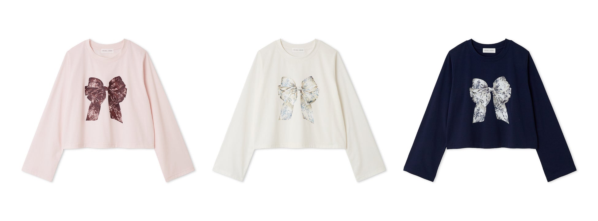 とろみのあるなめらかなカットソーに、ふんわりと結んだ大きなリボンをプリントした長袖のTシャツ。リボンにはリボンとフラワー柄のトワル・ド・ジュイ柄をプリントしました。ジャストなサイズ感のやや短め丈で、太めのロングパンツにバランスよくコーディネートしていただけます。