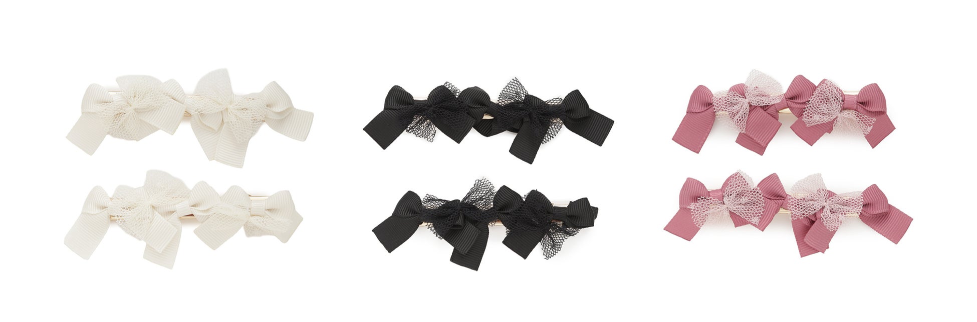 無地のグログランリボンとドット柄チュールのリボンをたっぷりとあしらいました。小さなバッグにも入れやすいサイズ感に加え、内ポケットも付いているので、細かいものまでしっかりと納まります。