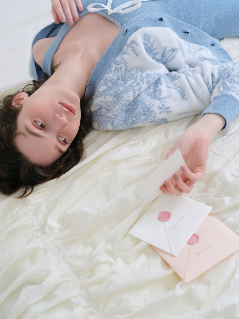 肉厚な生地を使用しており、ルームウェアのみならず外のコーディネートでも活躍間違いなしのアイテムです。ボタンは華やかにパールとビジューを使用し、花の形にデザイン。
