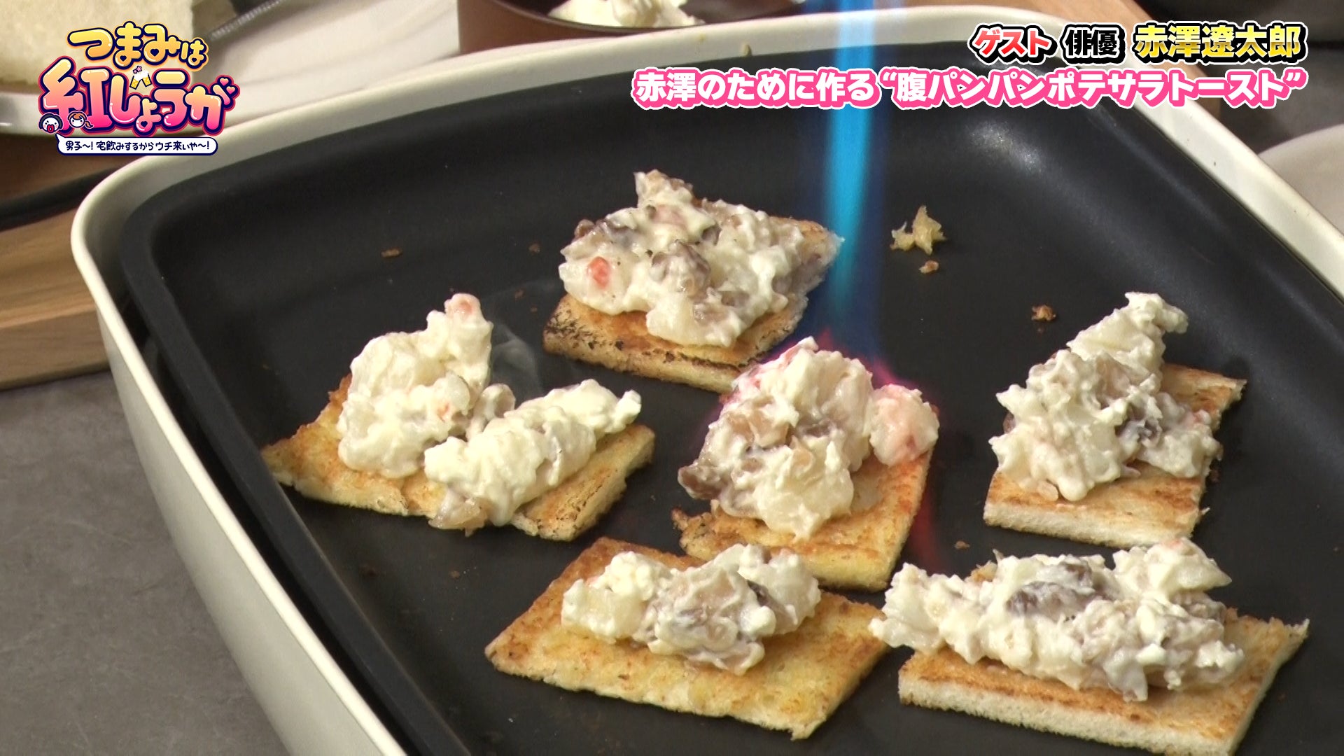 前回の放送で、稲田から「この番組で作るおつまみ、高カロリーなものが多い。たまには和食も作ってな」とリクエスト。それに対して、熊プロは「今日は任せてください、渋いおつまみという感じです!」と自信をのぞかせていましたが、今回作るおつまみのタイトルが「腹パンパンポテサラトースト」ということで、稲田から「もうええって!」とツッコミが入り、赤澤も「これは……カロリー爆弾ですね」とひと言。
