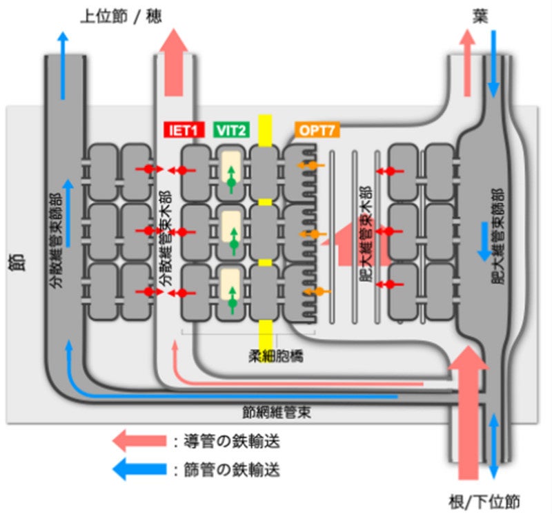 IET1は、この導管に節内で維管束間輸送された鉄を再度積み込むことで、新しい葉や穂への鉄の分配に重要な働きをします。
