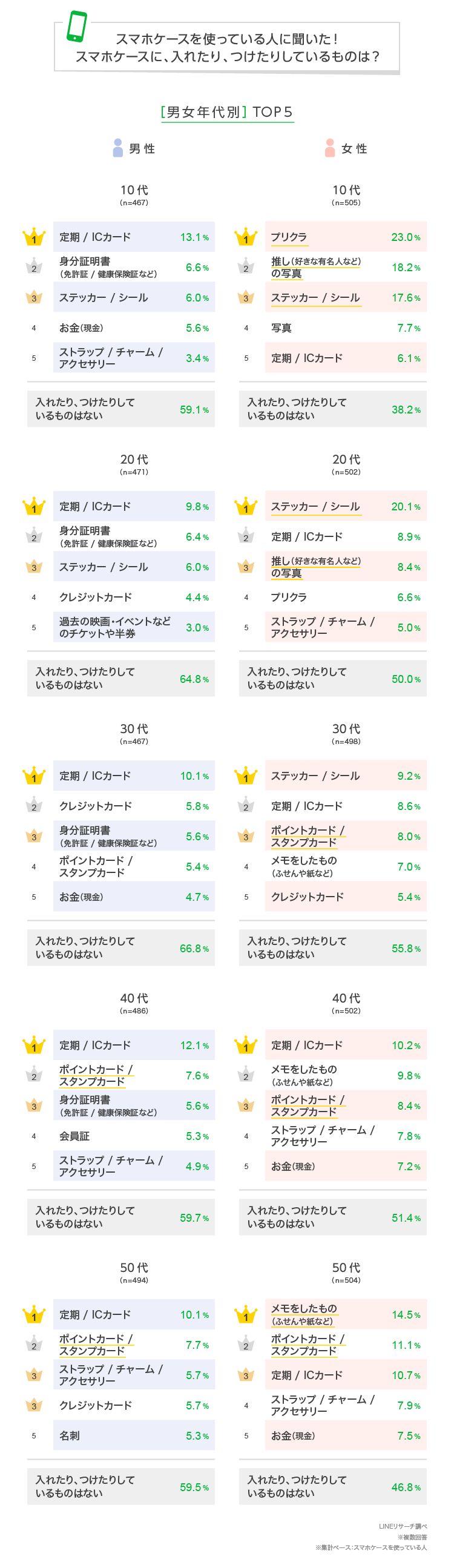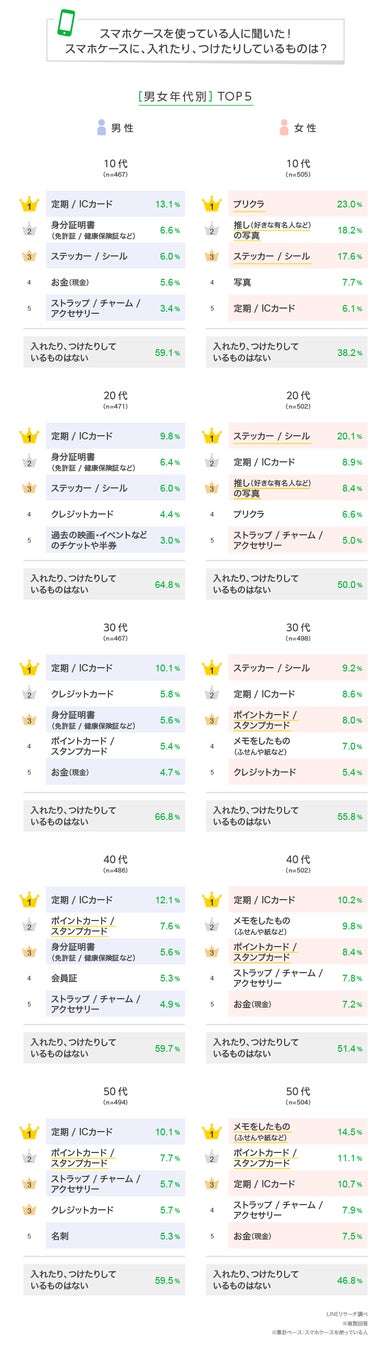 20代は「ステッカー / シール」がTOP。特に女性で割合が高く、10~20代女性では2割前後となり、「定期 / ICカード」よりも上位にランクインしました。