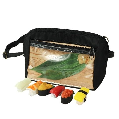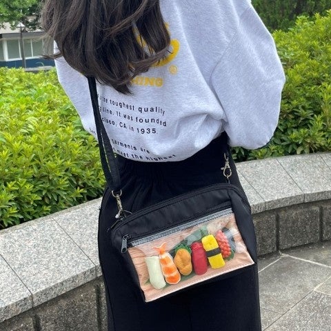 回らないお寿司屋さんの板とお寿司をショルダーバッグで表現。