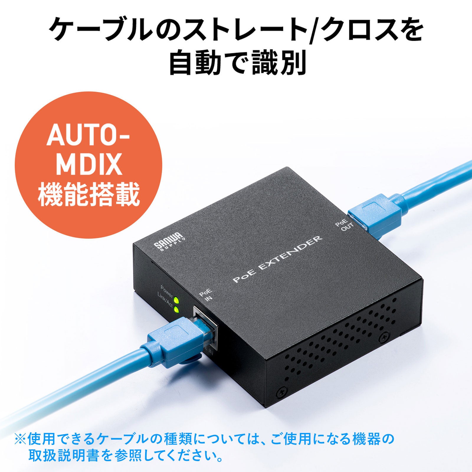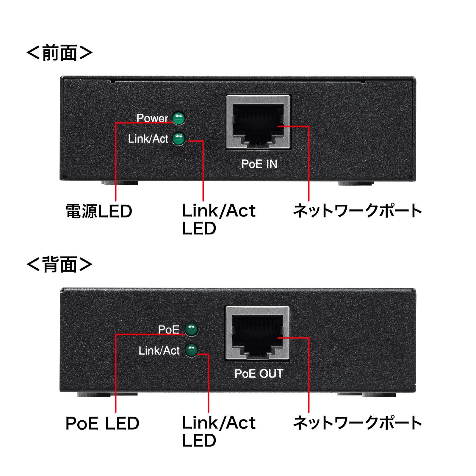 PoE受電による動作に対応しており、PoE対応LANケーブルを使用することで、中継地点にAC電源を準備することなく機器に電力を供給することができます。