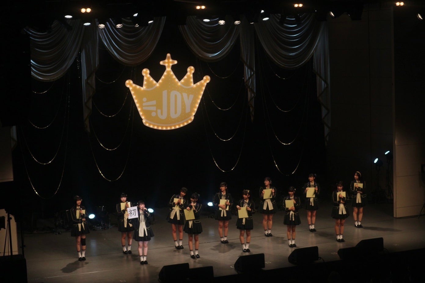続いて、キラキラのガーリーな衣装に着替えたメンバーは当公演ならではのメンバー編成でユニット曲を披露。市原愛弓、大信田美月、髙橋舞の3名は、=LOVEの「Sweetest girl」を、最年少メンバーである天野香乃愛、山野愛月は乃木坂46のデビュー曲「ぐるぐるカーテン」を披露。さらに逢田珠里依、大西葵、小澤愛実、村山結香のユニットでは、昨年公開されたTHE FIRST TAKEで話題の=LOVE楽曲「あの子コンプレックス」を、スペシャルなアコースティックバージョンでしっとりと歌い上げた。個性あふれる各ユニットでのパフォーマンスは、≒JOYの今後が楽しみなほど完成度が高いものだった。特に「あの子コンプレックス」では、ユニットメンバーの歌唱力と表現力で、会場の空気を一変、想像以上のポテンシャルの高さに、会場からはこの日一番の大きな拍手が沸き起こった。