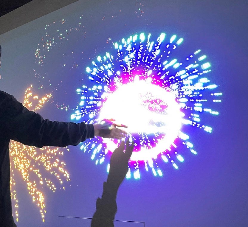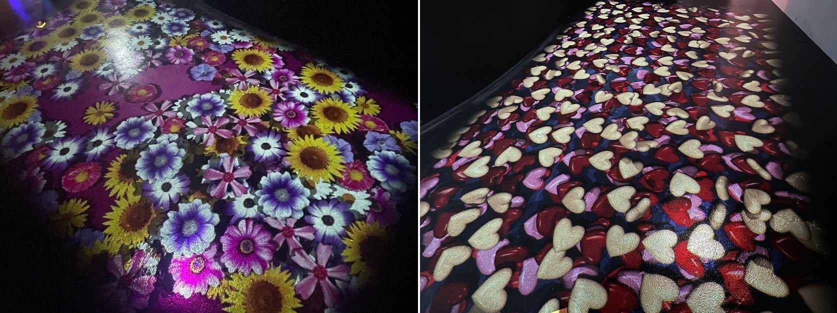 床面に投影された画像の上を、歩くことで映像が変化するインタラクティブな作品です。通常、時間経過とともに「お花」や「ハート」のオブジェなどのパターンに切り替わります。