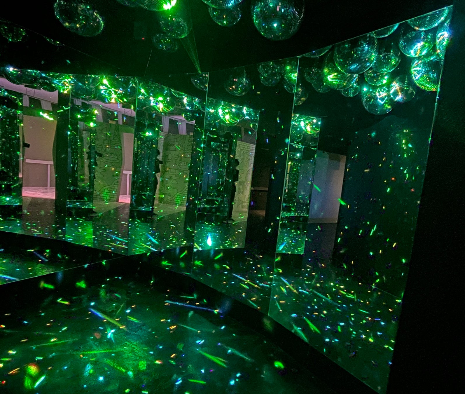 無数に散らばる光の中にはいってみたい!とにかく沢山のミラーボールを集め、鏡で部屋を囲い、レーザーを当てて実現!ぼっーと眺めて、小宇宙の旅に出かけよう!