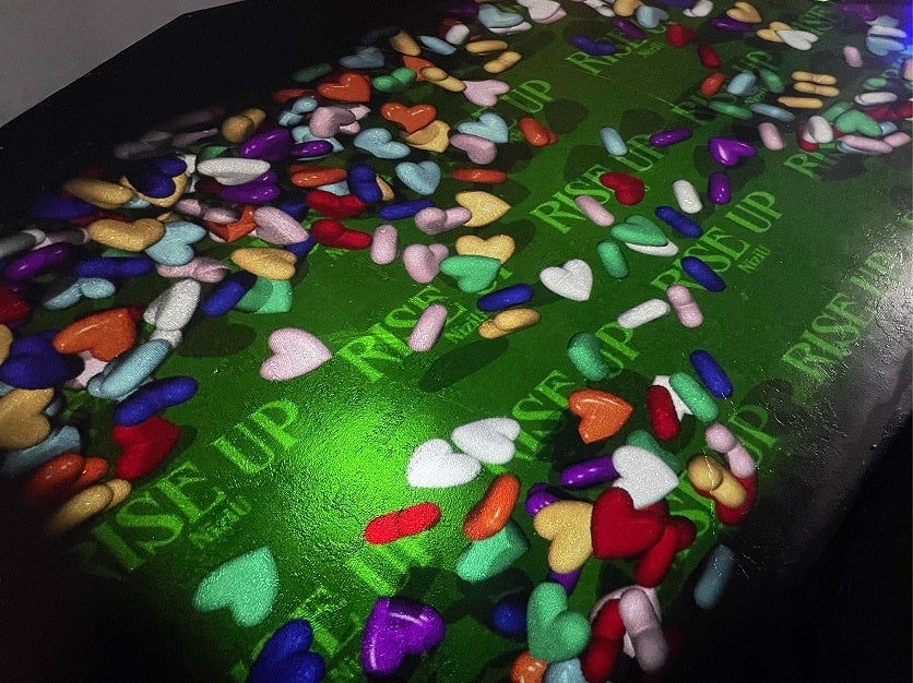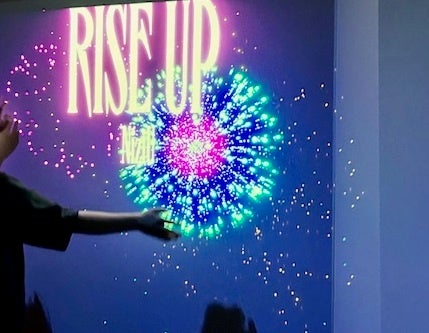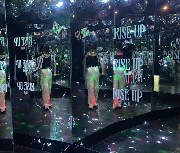 初の期間限定コラボ仕様の展示では、展示作品タイトル:『うつる、はしる、ひろがる』『ネオハイカラコスモ』『なげる、あてる、ひろがる』の3作品で、NiziUの1st EP『RISE UP』を記念した特別な展示を行いました。