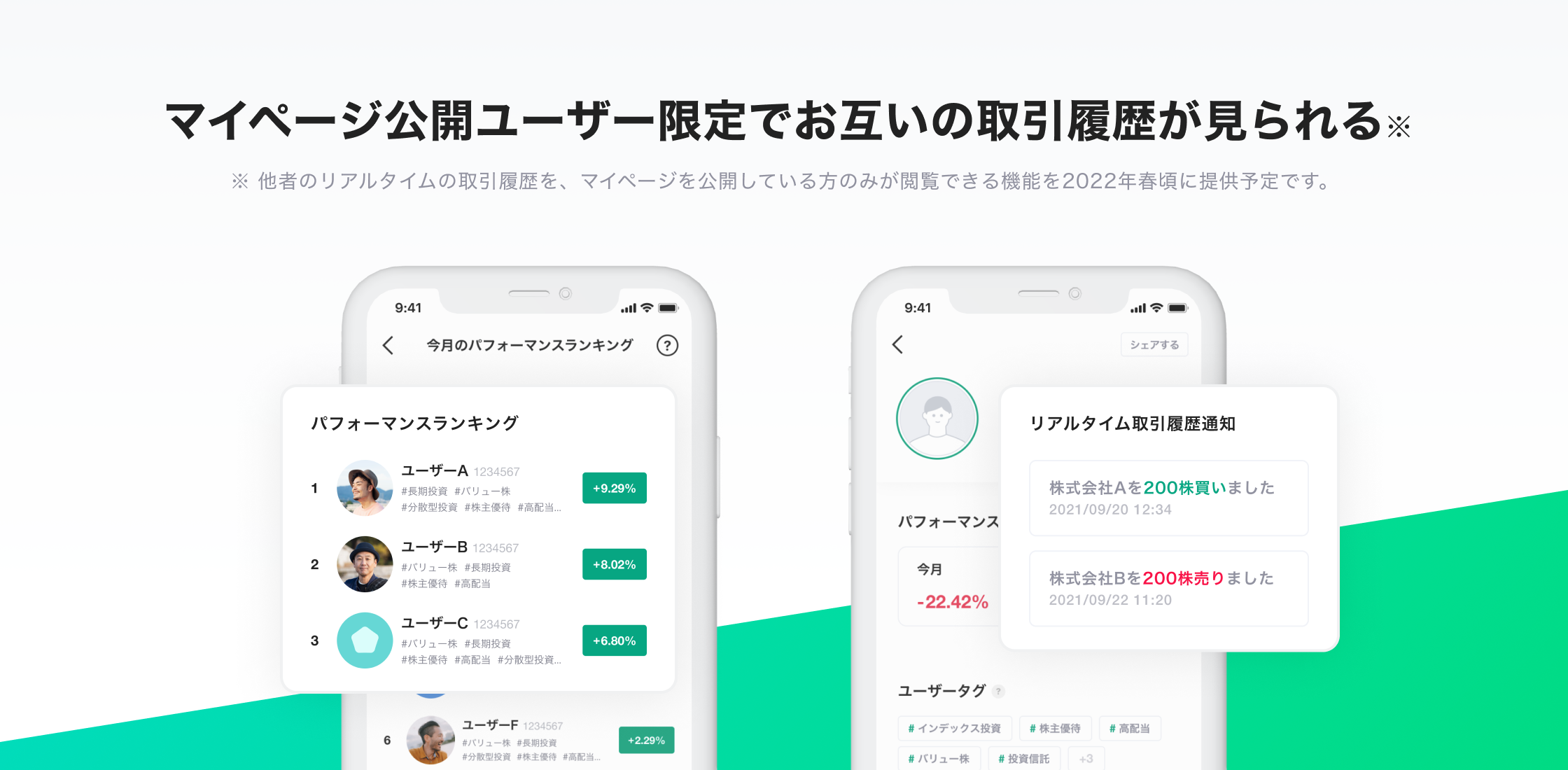 リアルタイムの取引履歴が見られる機能も2022年春頃提供予定 運用成績のランキング公開でユーザー同士が実践的に投資を学ぶことも可能に