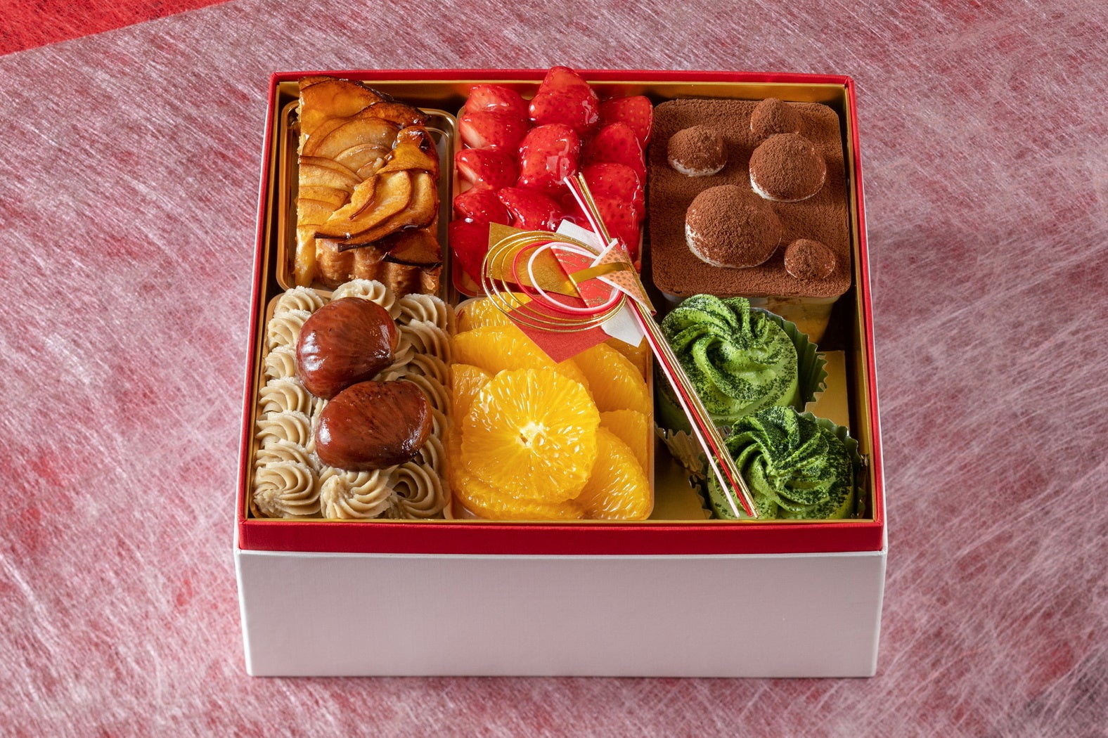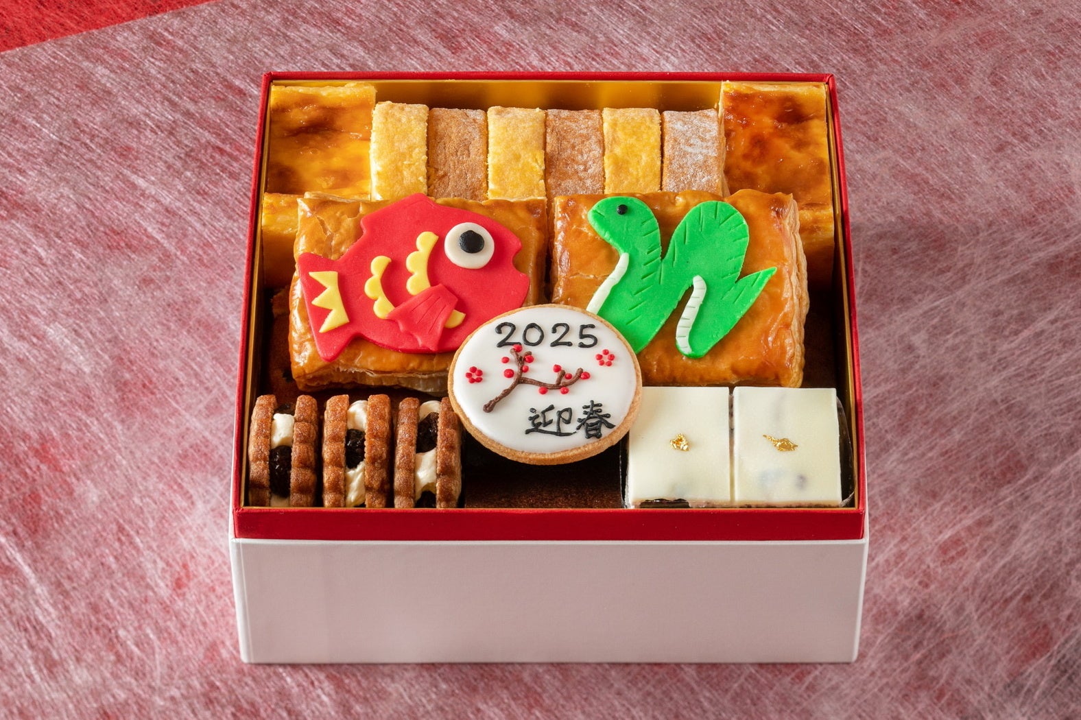 2025年のスイーツおせちは、全国各地のご当地食材をパティシエが厳選して作ったスイーツを、彩り豊かな二段重に詰め合わせました。地元川崎からは、高津区の養蜂家である木嶌さんが作った濃厚でコクがある「かわさき産はちみつ」を使ったロールケーキをご用意するほか、愛媛生まれのオリジナル品種「紅まどんな」を敷き詰めたムース、“いちごの王様”と称される福岡の「博多あまおう」を使ったタルトのほか、2025年の干支「巳」をあしらったパイや、お正月柄をモチーフにパティシエが手描きしたアイシングクッキーなど、全17品目がご堪能いただけます。