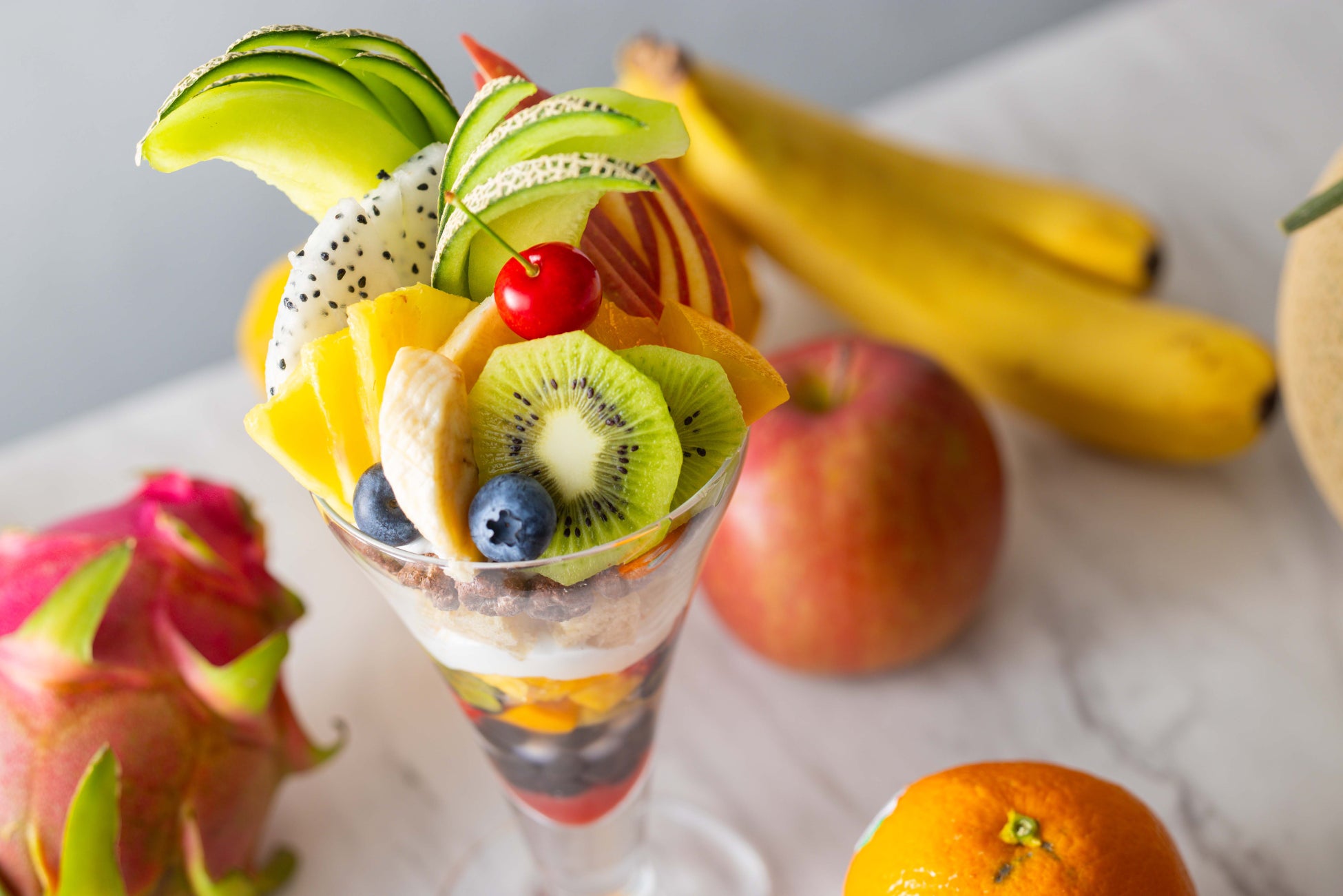 艶やかなさくらんぼに、濃密な甘みのマンゴー、香り立つメロンやジューシーなキウイ、ブルーベリー、そしてドラゴンフルーツやリンゴまで、厳選されたみずみずしい果実がグラスに彩り豊かに詰め込まれ、贅沢な果実の饗宴を楽しめます。グラスの中で重ねられた素材それぞれが、味わいと食感の多彩なリズムを奏で、まるでオーケストラのように味の調和が広がります。