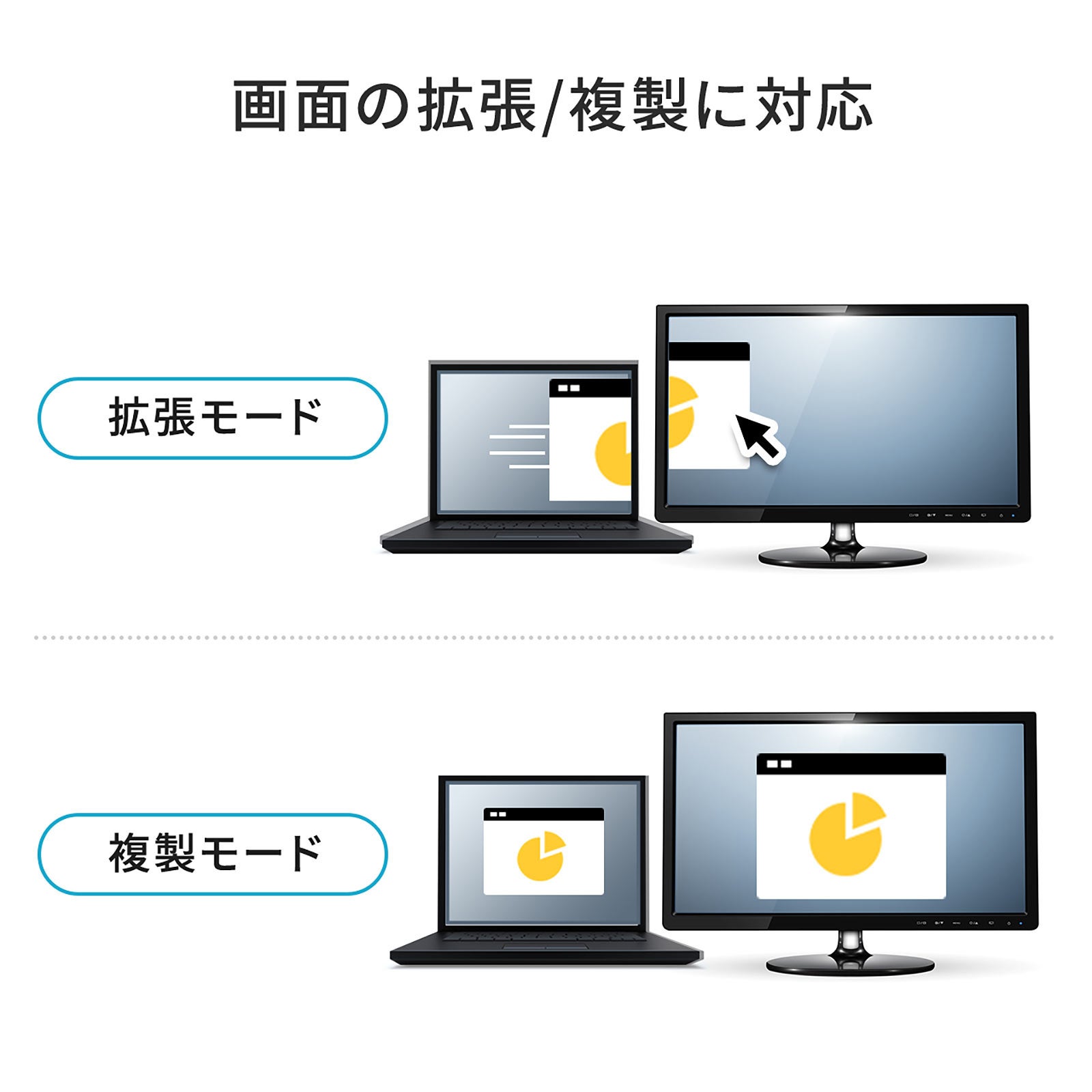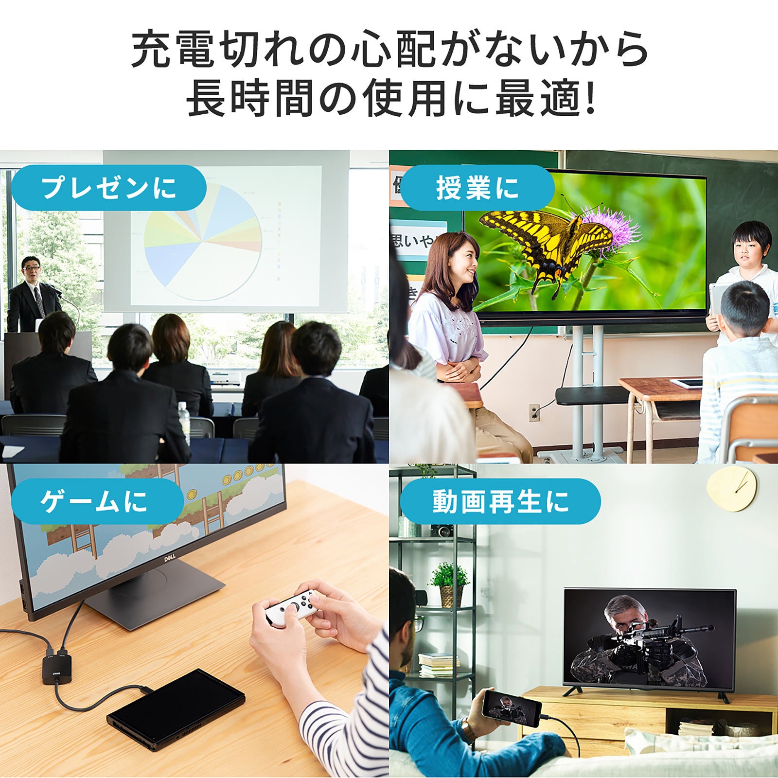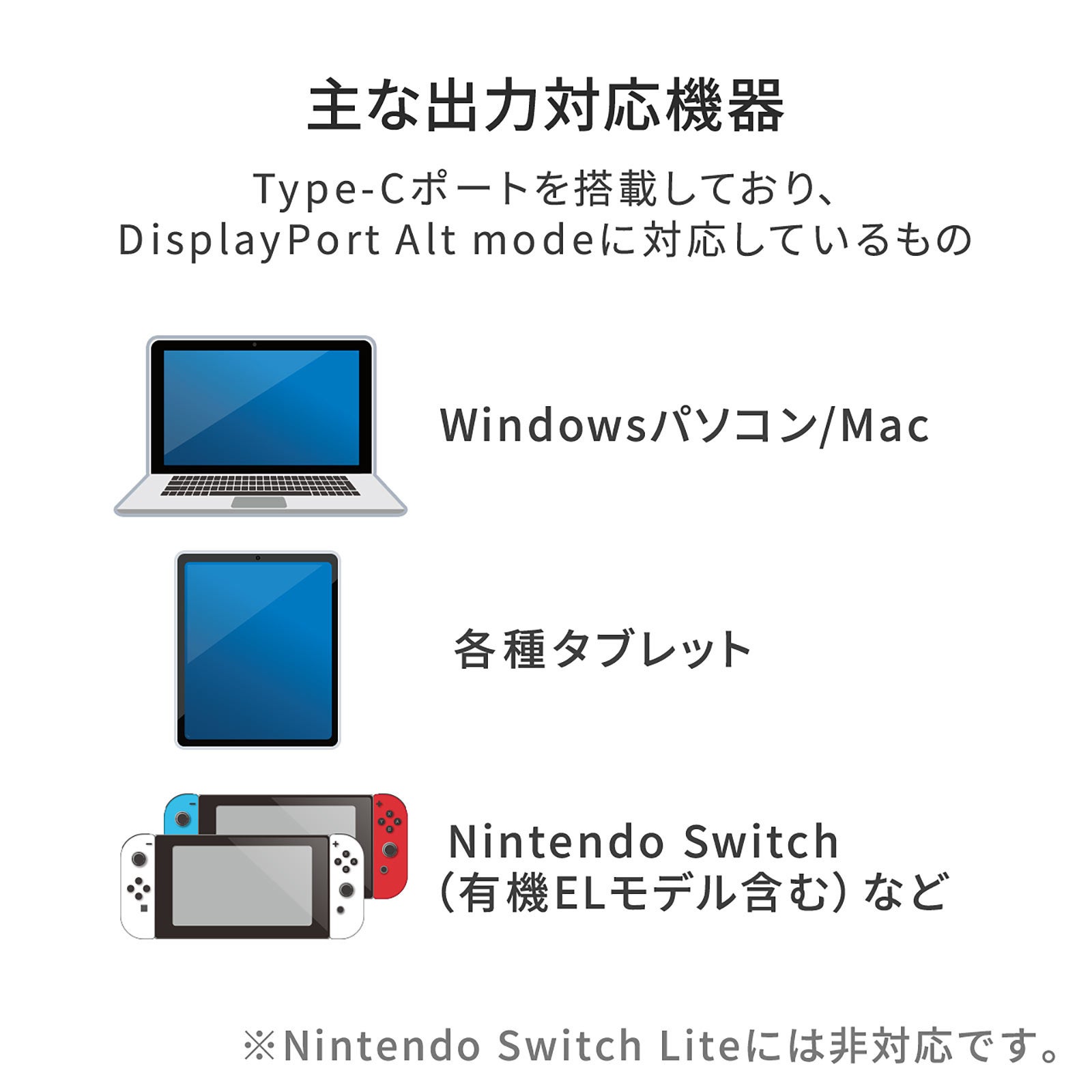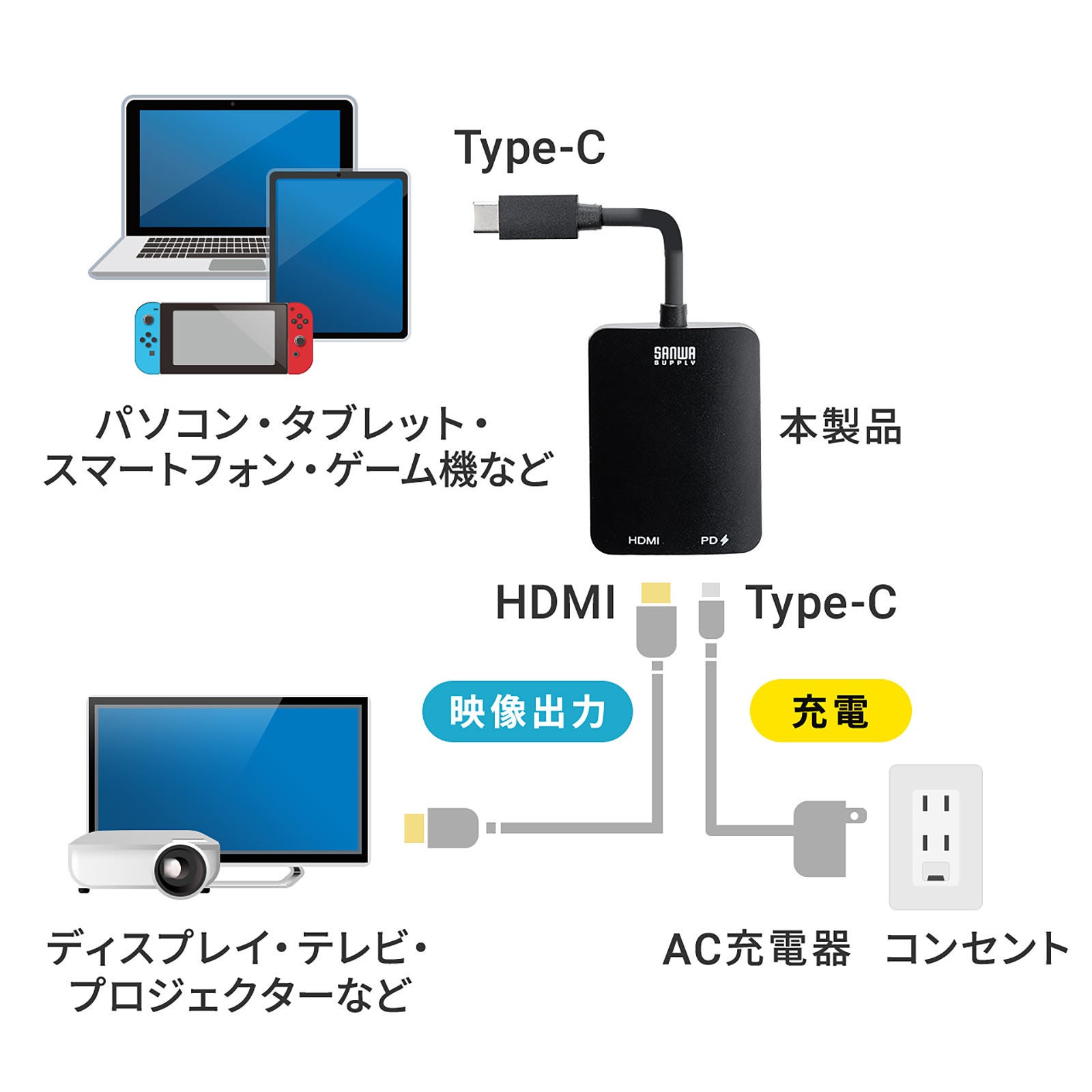 本製品は、USB Type-C搭載(映像出力に対応したType-Cポートのみ)のパソコンやタブレットからHDMI入力端子を持つディスプレイやテレビなどに映像や音声を出力することができます。