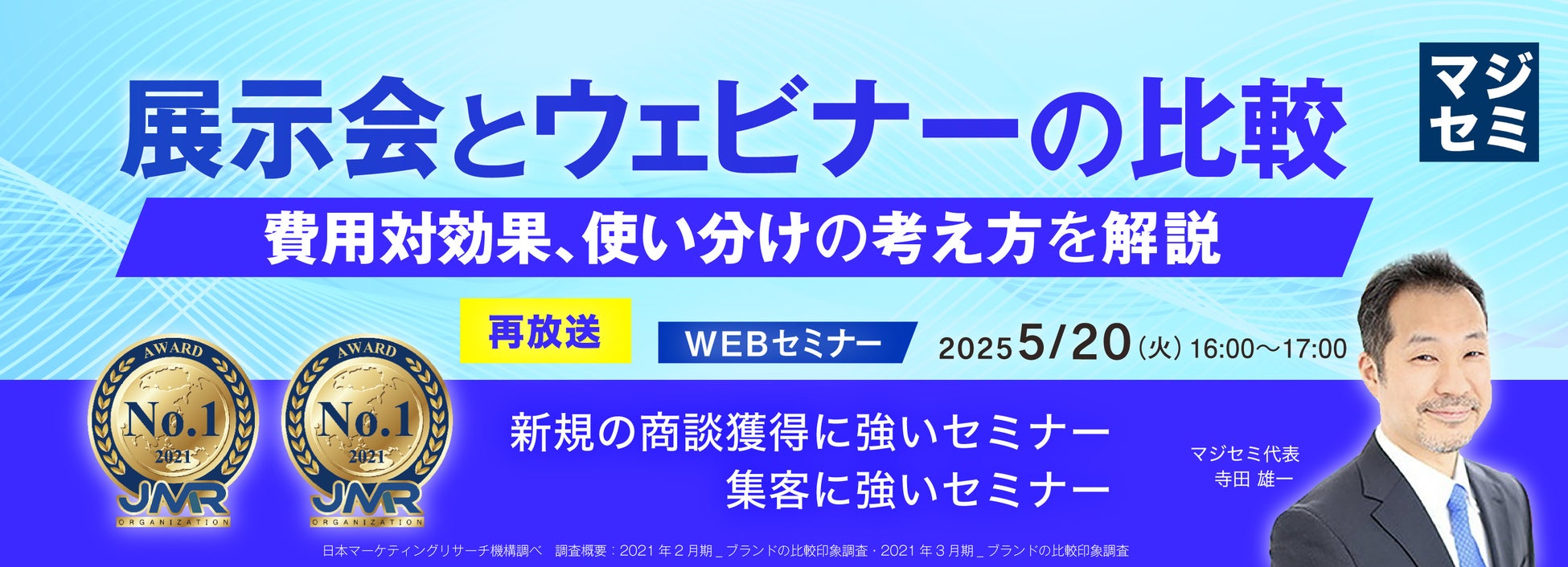 マジセミ株式会社は、大変好評をいただいた「【再放送】展示会とウェビナーの比較」というテーマのウェビナーを再放送します。