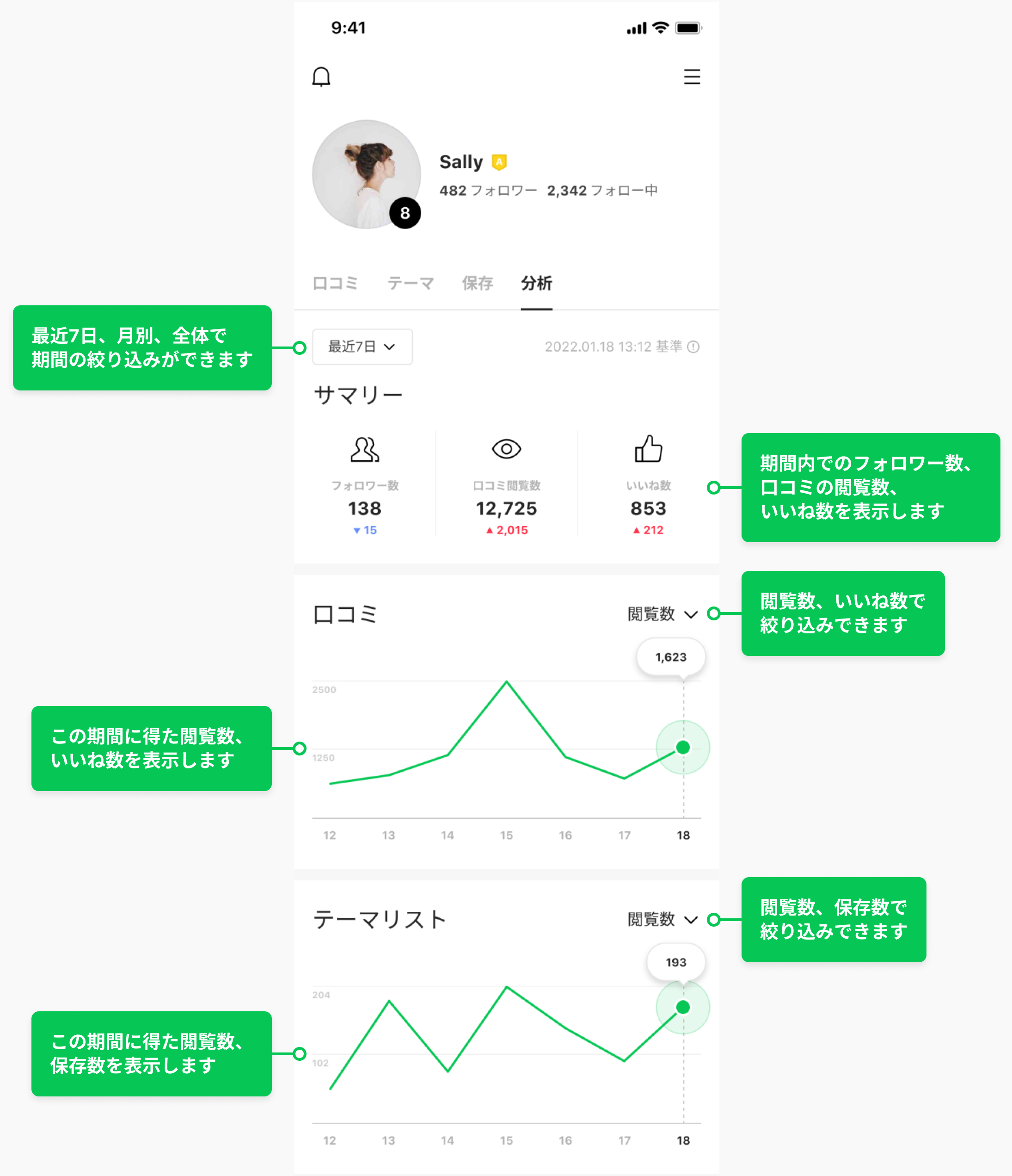 このたびのアップデートでは、自分の投稿に対する他ユーザーからのリアクションがより詳しく閲覧できる項目を追加しました。指定期間内の「フォロワー数」「口コミ閲覧数・いいね数」「テーマリスト閲覧数・保存数」の推移や増減といった、日々の投稿に対するリアクションをグラフ等の直感的な見た目で確認することができます。