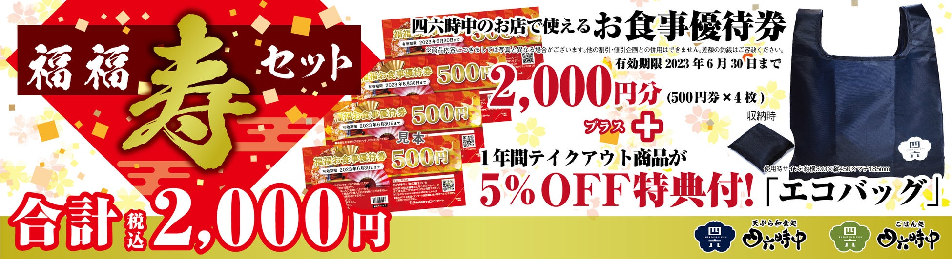 「エコバック」と全国の四六時中で使用できる「お食事優待券(2千円分)」がセットになったお得な「福福寿セット」(税込2,000円)の発売を12月20日からスタートいたします。オリジナル「エコバック」は『天ぷら和食処』『ごはん処』にご持参いただき、テイクアウト商品をご購入いただくと5%割引となる特典付きです。(2024年1月31日まで)