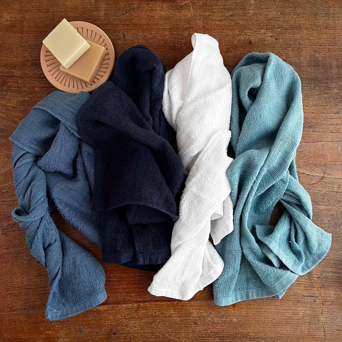 大阪「泉州タオル」のニューフェイスで、その名も「温泉州タオル」です。日本独自のお風呂文化から生まれた“温泉タオル”の薄いタオルの使いやすさ・使い心地を見直し、温故知新。発祥の地・泉州で、原点に返って新たに生み出されたタオルなのです。洗う・絞る・拭く。お風呂での動作を1枚でこなす、いわゆる「浴用タオル」として使うのがおすすめです。多重ガーゼ織りとパイル織りが交えてあっていてよく見ると、しましまです。細い単糸をパイル糸と緯糸の一部に使用しているので、薄いながらもほどよいボリューム感。少し薄め&長めなので使いやすくて、まさに「浴用タオル」のお手本みたいなタオルです。温泉や銭湯のおともにちょうどイイのです。