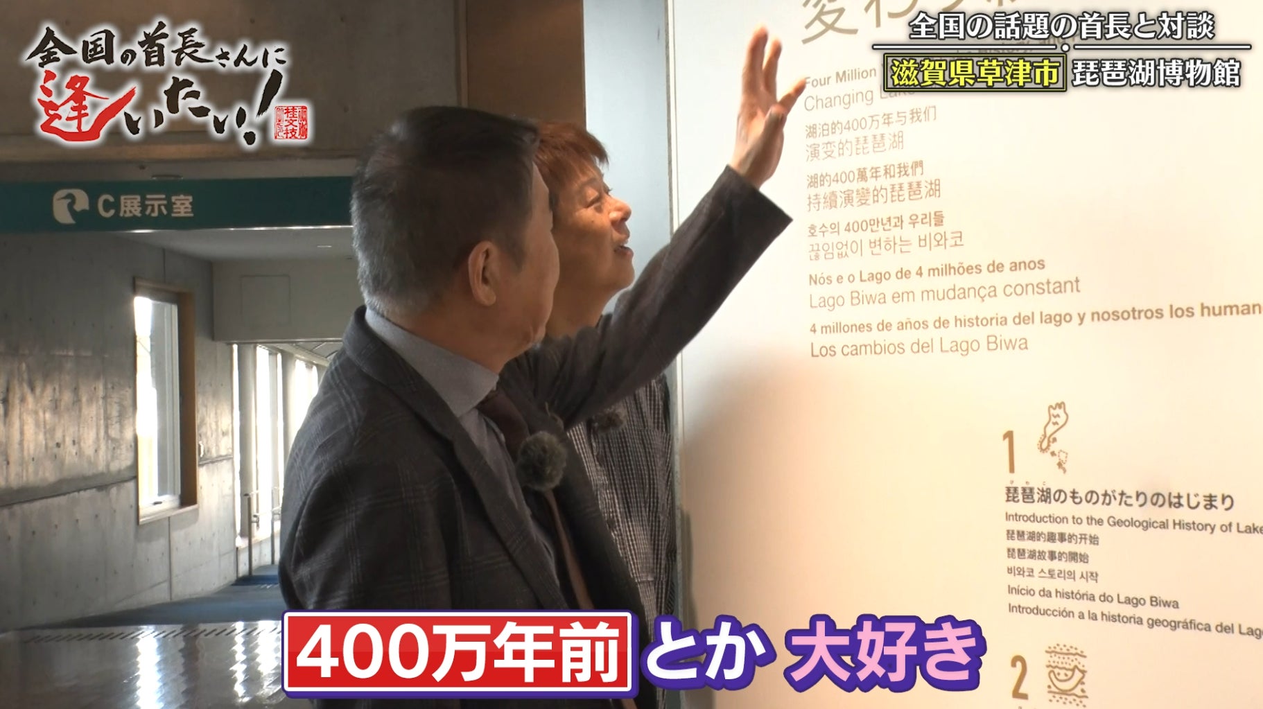 びわ湖の成り立ちを解説する展示室では、約400万年前に誕生したびわ湖の歴史を学びます。また、周辺に生息していた生物を紹介するコーナーでは、アケボノゾウの復元骨格やツダンスキーゾウの半身半骨展示を観察。大きな骨格を前に、ロッシーが「こんなん難波とかにおったらたまらん」と驚く場面もあります。